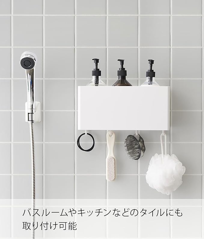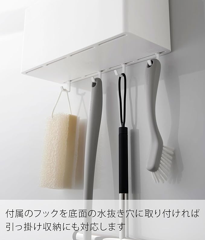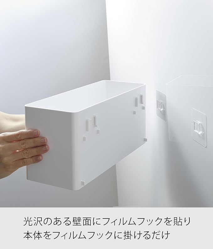 フィルムフックでお好みの位置に簡単取り付けできるバスケット。浮かせるのでぬめらず衛生的。フィルムフックに掛けるだけ。光沢のある壁面に取り付けられます。ガラスドアにも。掃除用品の収納に。タイルにも取り付け可能。コンロまわりの壁面に。お風呂用のおもちゃ入れに。ディスペンサーやケアグッズの収納に。ドライヤーやブラシの収納に。付属のフックを底面の水抜き穴に簡単取り付け。掃除道具などの小物を掛けて収納できます。