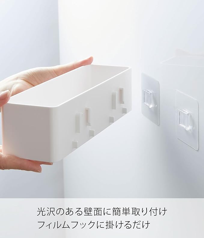 フィルムフックでお好みの位置に簡単取り付けできるストレージラック。浮かせるのでぬめらず衛生的。フィルムフックに掛けるだけ。光沢のある壁面にフィルムフックで簡単取り付け。掃除用品の収納に。タイルにも取り付け可能。コンロまわりの壁面に。ケアグッズの収納に。ドライヤーやブラシの収納に。付属のフックを底面の水抜き穴に簡単取り付け。小物を掛けて収納できます。
