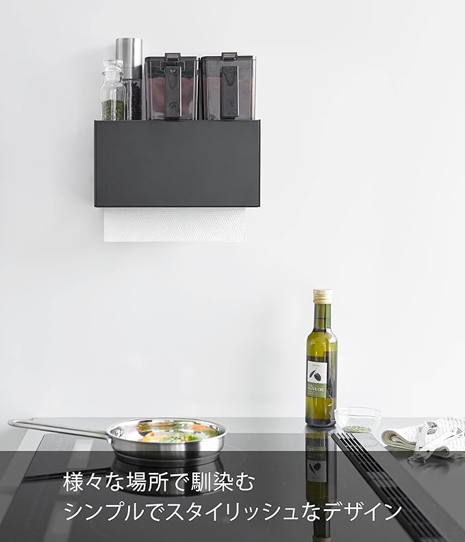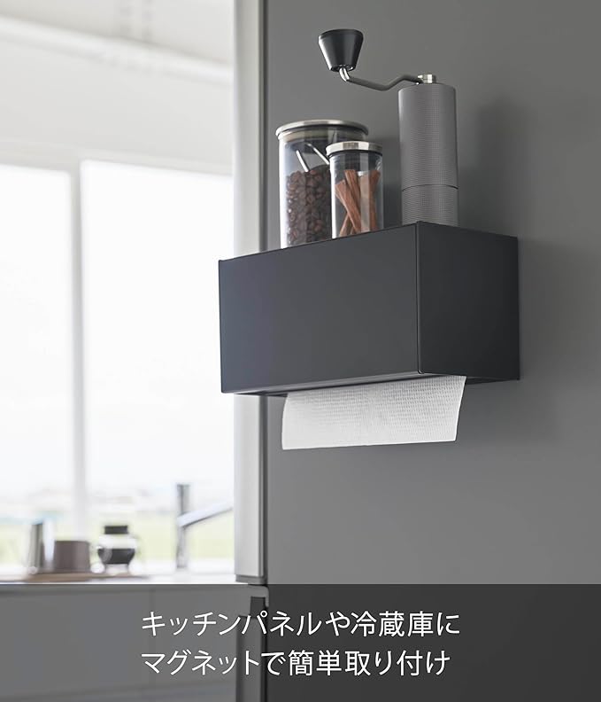 マグネットでキッチンパネルや冷蔵庫に簡単取り付け。片手でサッと取り出せるペーパータオルディスペンサー。シンプルでスタイリッシュなデザインなので場所を選ばずスマートに設置。水回りに設置することで野菜などの水切りや台拭きとしてペーパータオルを使用できます。上面はトレーになっているのでスパイスボトルなどのキッチン小物を収納できます。補充の際は前面の蓋を開けるだけ。開口部が広いのでペーパーの補充も簡単です。ペーパータオル・キッチンペーパー・ティッシュペーパーのボックスやソフトタイプにも対応。コンロ横に設置すれば、油汚れなどの拭き掃除に便利です。