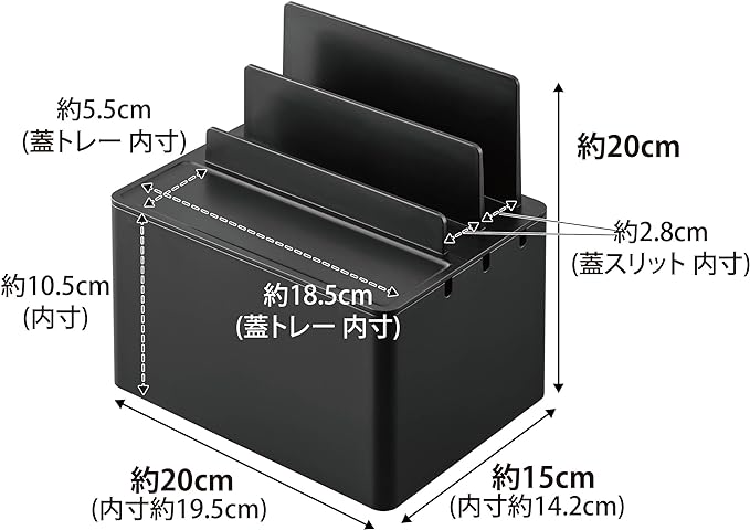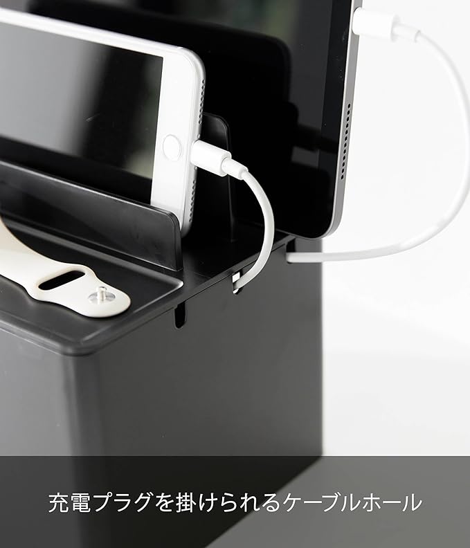 充電したままガジェット類をスッキリ収納できるステーションボックス。日常使いのタブレットやスマートフォンを充電しながら一括収納できます。ごちゃつく電源タップとコードを隠して充電ステーションに。ガジェット類のスタンドとしても。お子様の学習用タブレットや文具の収納場所に。角度調節して立てかけられる突起付き。充電プラグを掛けられるケーブルホール付き。背面から電源タップのコードを出せます。充電ケーブルをスッキリ収納できます。中に電源タップ(3口まで)を入れて充電器をセットできます。