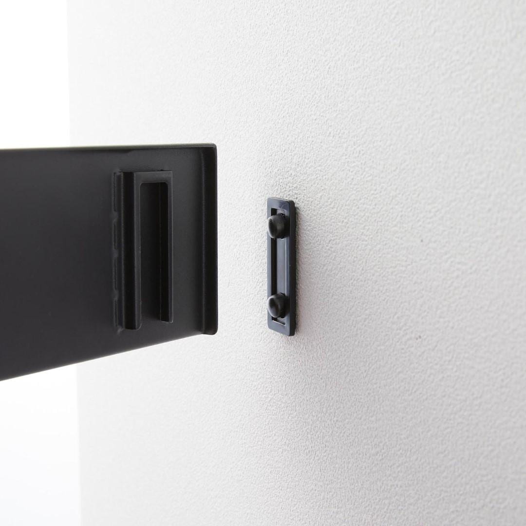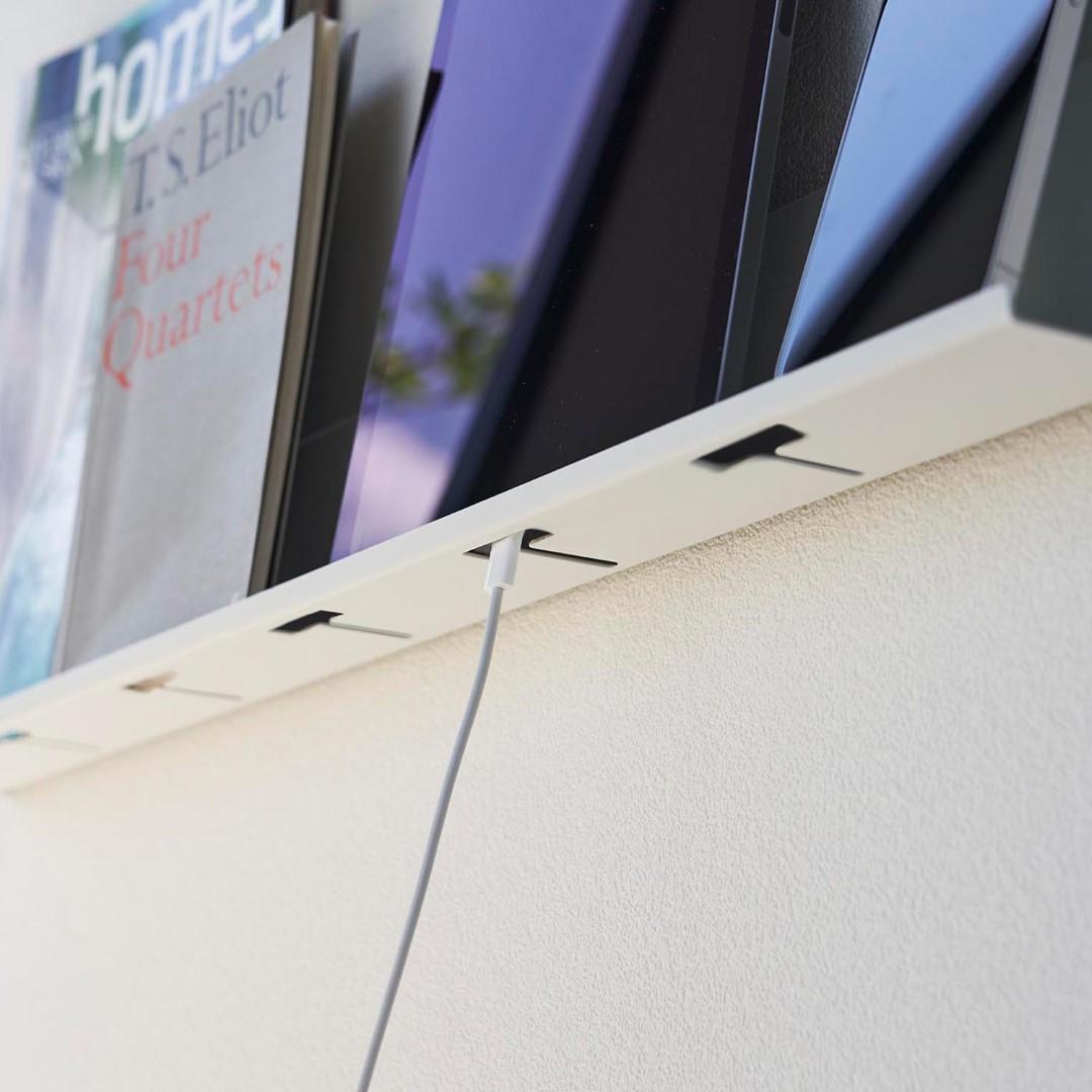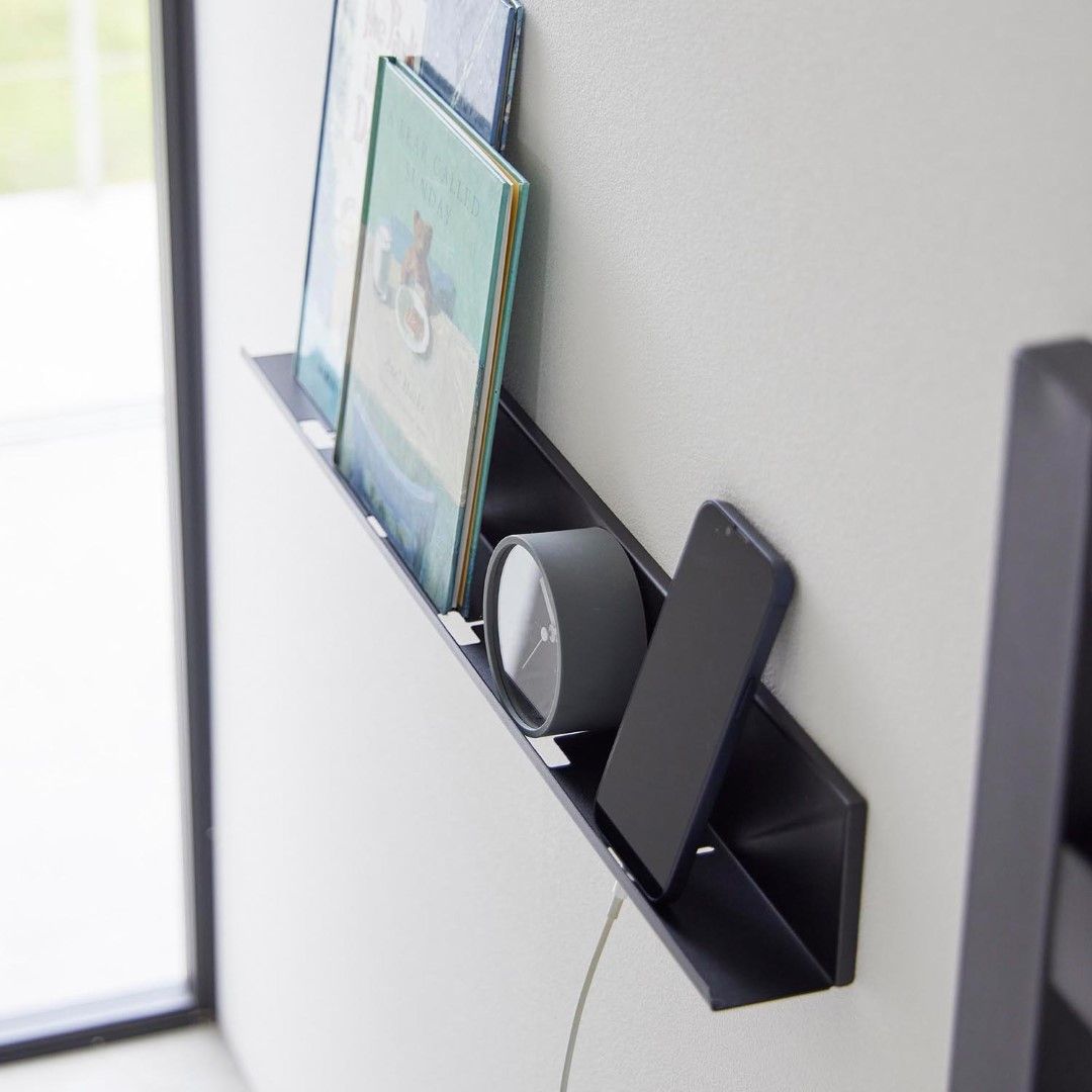 ウォールシェルフにタブレットPCの定位置を 何もない余った壁面を収納スペースとして有効活用。タブレットPCを置くのにぴったりなスリムタイプの棚です。まるで書店のディスプレイのように表紙を見せて並べられる本棚としてもお使いいただけます。どのお部屋にもぴったりな2色のカラーバリエーション カラーは、明るい印象のホワイトと、スタイリッシュなブラックをご用意しました。どのお部屋のインテリアにもなじみやすい、シンプルなモノトーンカラーです。壁紙の色、カーテンやベッドリネンに合わせてなどお好きなカラーをお選びください。ナイトテーブル代わりに。 本やメガネ置きにも 動画を視聴、調べ物や仕事をしたりと寝る間際までタブレットPC使用していることも多いはず。寝室の枕元近くに棚を取り付ければ、ベッドに居たまますぐ手に取れるのに、サイドボードのように場所を取らないという空間的メリットが生まれます。ケーブル先端が落ちない。 充電しなくでも棚の定位置にキープ タブレットPCやスマートフォンを立てたまま充電できます。充電のためにわざわざ棚から取り出す必要が無く、充電しながら映画を観たり、学習したりできちゃいます。充電ケーブルの先端が落ちづらい設計なので、充電をしていないときでもケーブルの先端が棚から落ちずにいるのが高ポイント。 充電の度にわざわざケーブル先端を拾って……というちょっとしたストレスがかかりません。壁の穴が目立ちにくい石こうボードピン取り付け 石こうボードピンで設置するので、取り外したときに壁の穴が目立ちにくいのがうれしいポイント。大きな力は必要なく、コインを使って指でピンをぐっと押し込むだけ。女性でも簡単に取り付けが完了します。付属の木ネジを使えば柱や板壁に取り付けることも可能です。