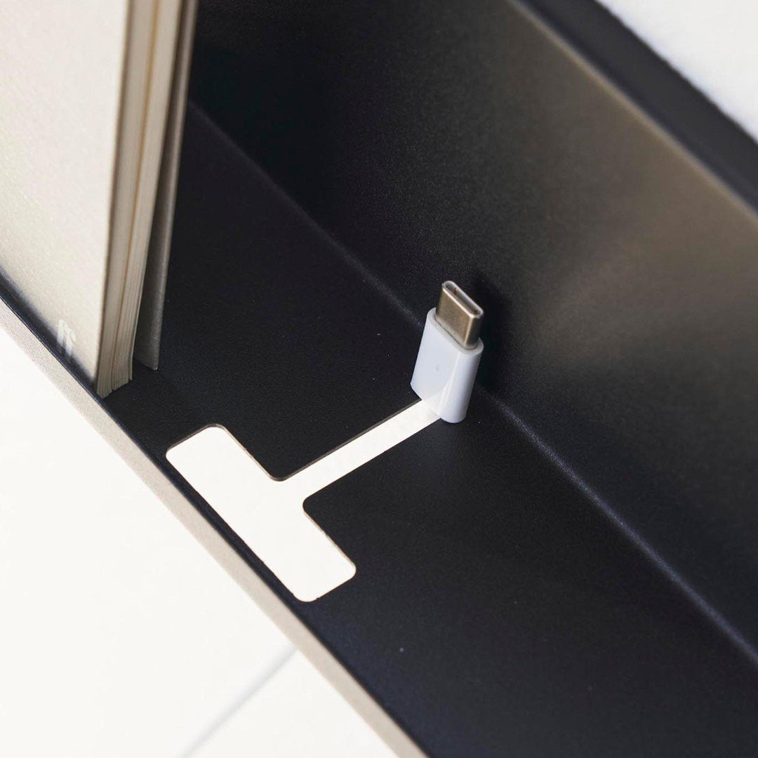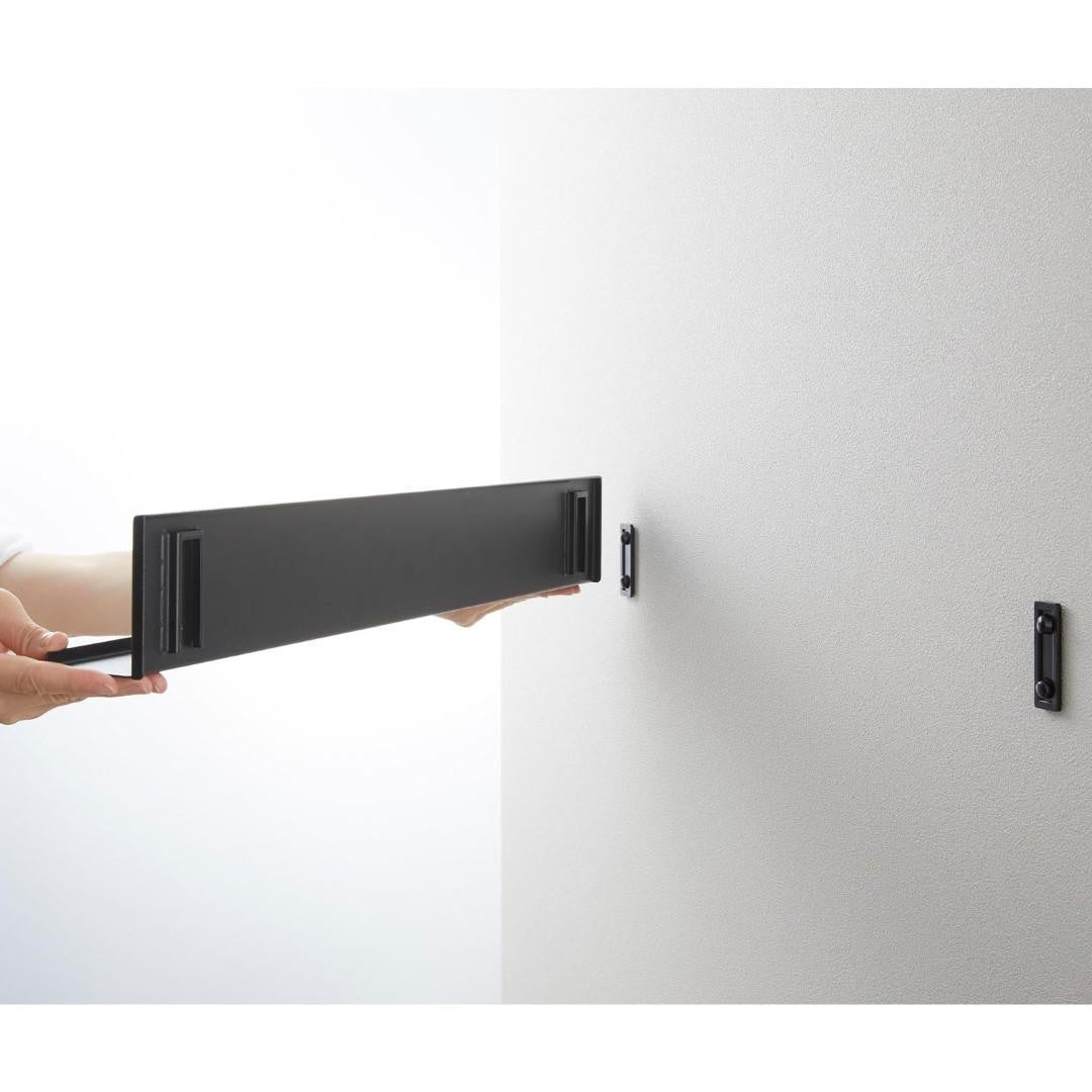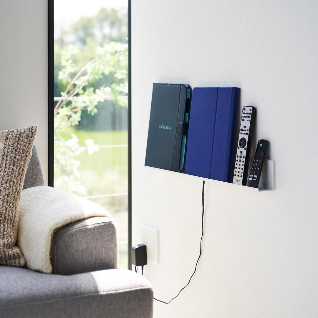 ウォールシェルフにタブレットPCの定位置を 何もない余った壁面を収納スペースとして有効活用。タブレットPCを置くのにぴったりなスリムタイプの棚です。まるで書店のディスプレイのように表紙を見せて並べられる本棚としてもお使いいただけます。どのお部屋にもぴったりな2色のカラーバリエーション カラーは、明るい印象のホワイトと、スタイリッシュなブラックをご用意しました。どのお部屋のインテリアにもなじみやすい、シンプルなモノトーンカラーです。壁紙の色、カーテンやベッドリネンに合わせてなどお好きなカラーをお選びください。ナイトテーブル代わりに。 本やメガネ置きにも 動画を視聴、調べ物や仕事をしたりと寝る間際までタブレットPC使用していることも多いはず。寝室の枕元近くに棚を取り付ければ、ベッドに居たまますぐ手に取れるのに、サイドボードのように場所を取らないという空間的メリットが生まれます。ケーブル先端が落ちない。 充電しなくでも棚の定位置にキープ タブレットPCやスマートフォンを立てたまま充電できます。充電のためにわざわざ棚から取り出す必要が無く、充電しながら映画を観たり、学習したりできちゃいます。充電ケーブルの先端が落ちづらい設計なので、充電をしていないときでもケーブルの先端が棚から落ちずにいるのが高ポイント。 充電の度にわざわざケーブル先端を拾って……というちょっとしたストレスがかかりません。壁の穴が目立ちにくい石こうボードピン取り付け 石こうボードピンで設置するので、取り外したときに壁の穴が目立ちにくいのがうれしいポイント。大きな力は必要なく、コインを使って指でピンをぐっと押し込むだけ。女性でも簡単に取り付けが完了します。付属の木ネジを使えば柱や板壁に取り付けることも可能です。