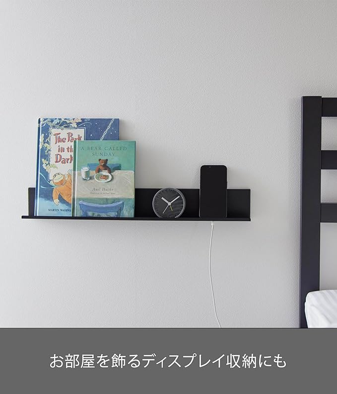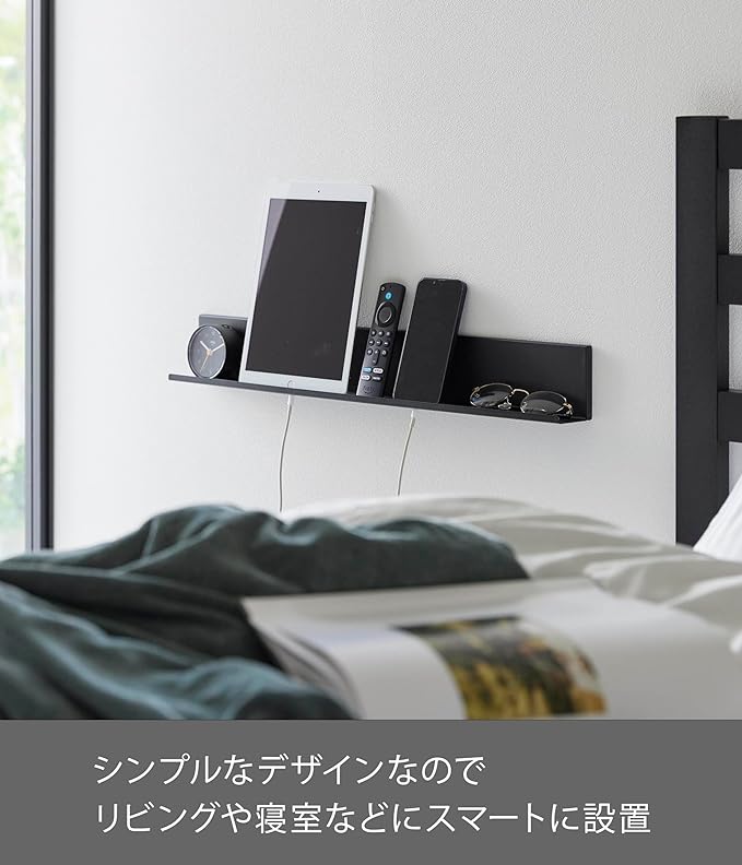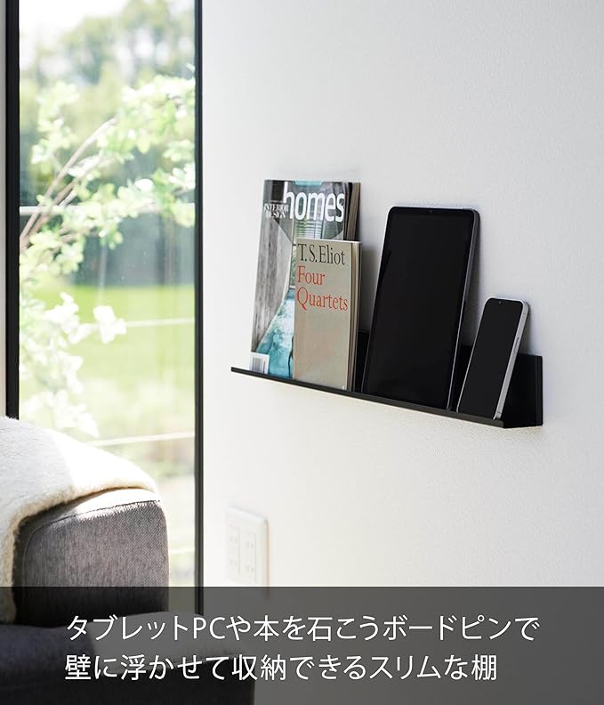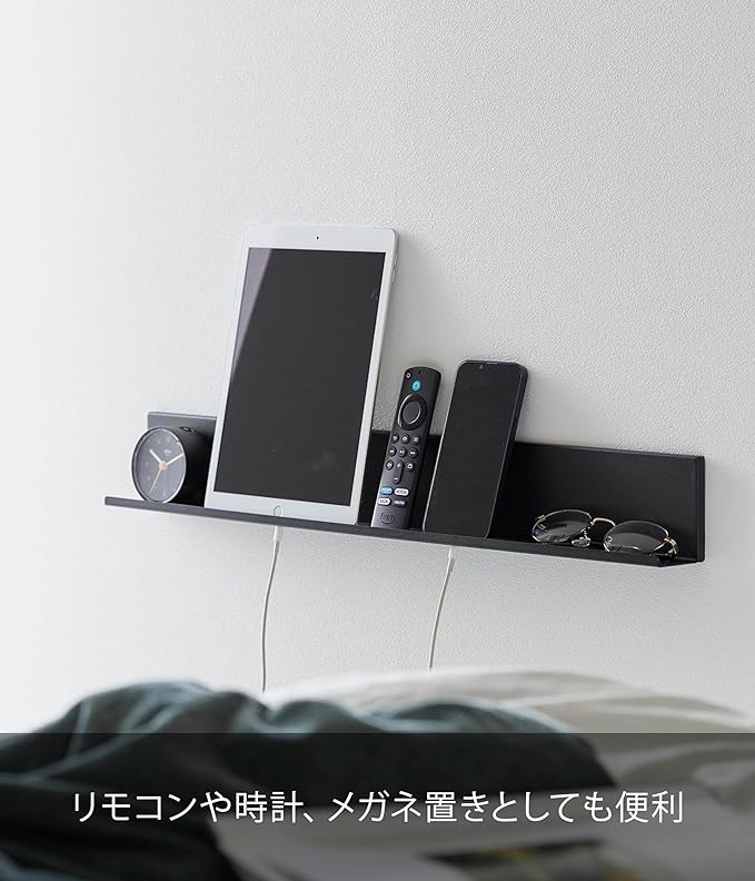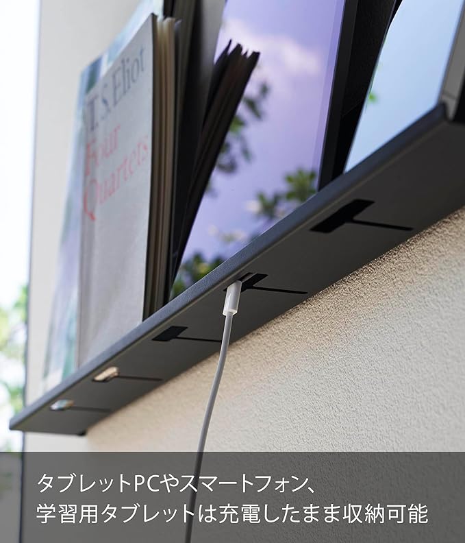 タブレットPCや本を石こうボードピンで壁に浮かせて収納できるスリムな棚。場所を選ばないシンプルなデザインなのでリビングや寝室の壁面にスマートに設置。タブレットPC以外にもリモコンや時計・メガネ置きとしても便利。タブレットPCやスマートフォン以外にも学習用タブレットなども充電したまま収納可能。充電をしない時には充電ケーブルの先端を引っ掛けて収納できます。取り付けベースを取り付けてはめ込むだけ。石こうボードピンで壁の穴が目立ちにくい。木ネジでも設置可能。