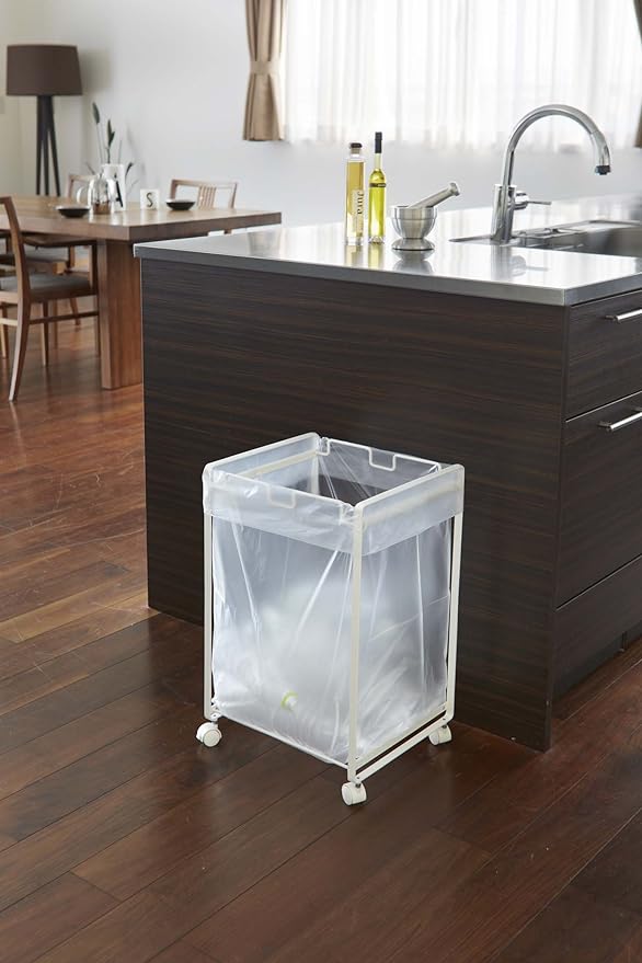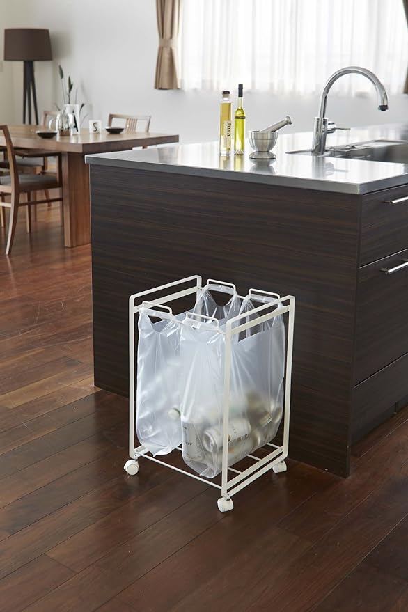 お手持ちのごみ袋やコンビニやスーパーの袋を引っ掛けてお使いいただけます。キャスターが付いているので、袋の取り外しやお掃除の際の移動もスムーズです。 レジ袋の持ち手を掛けるだけで分別自在。瓶・缶・ペットボトルなどを分別できます。