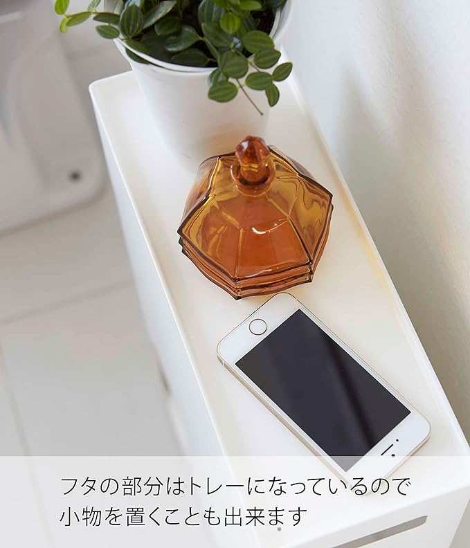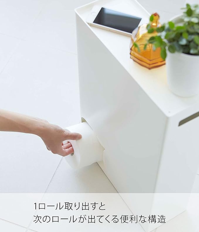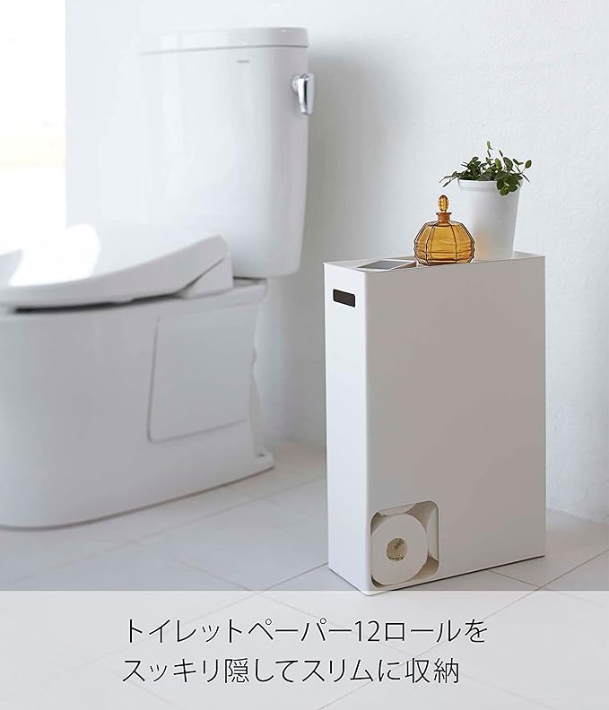 トイレットペーパー12ロールを美しく隠してスリムに収納。1ロール取り出すと次のロールが出てくる便利な構造。コーナーに置けば存在を主張せず、空間に美しくなじみます。取り出し口が両面に貫通しているので設置の向きに困ることもありません。取っ手穴が付いているので移動や掃除もラクラク。