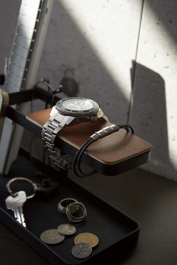 身に着けている物をまとめて収納できるデスクバーです。携帯電話はもちろん、リモコンや眼鏡に鍵などさまざまな物を収納できます。バーには時計やブレスレットなどを掛けて収納でき、男性物の大きい時計でも2個収納できます。