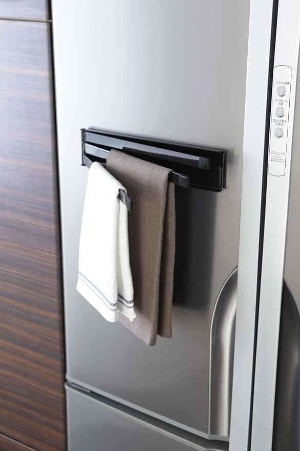 冷蔵庫の扉や側面にマグネットで簡単取り付けの布巾ハンガーです。ハンガーバー部分が大きく開くので、布巾どうしを離して掛けられるから乾きやすいのが特徴です。