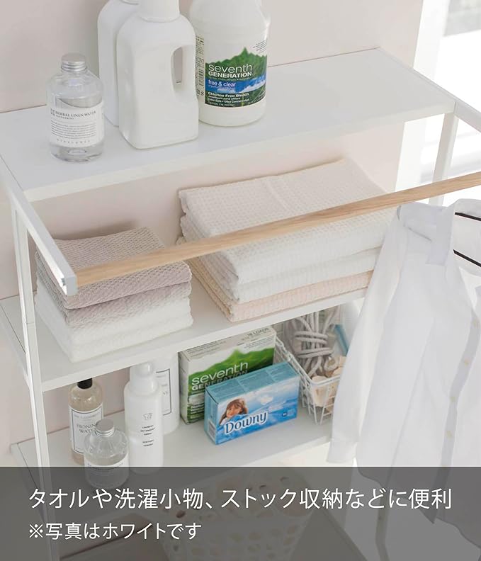 壁面に立て掛けるだけのランドリーシェルフ。タオルや洗濯小物の収納、ストックに便利です。一時干しに便利なハンガーバー付き。 壁面に立て掛けて使用可能。