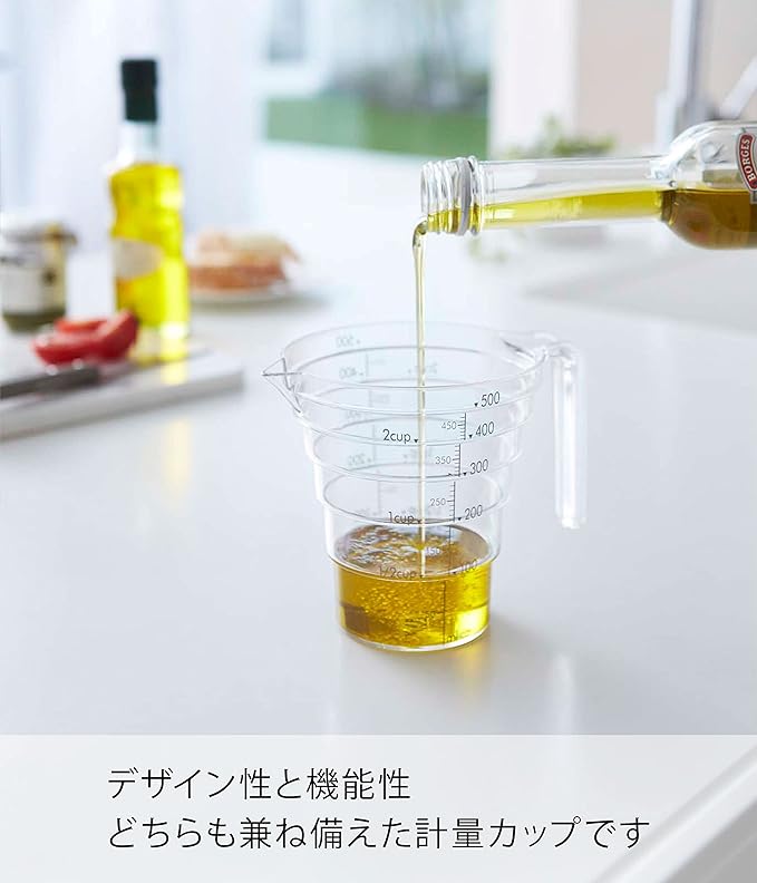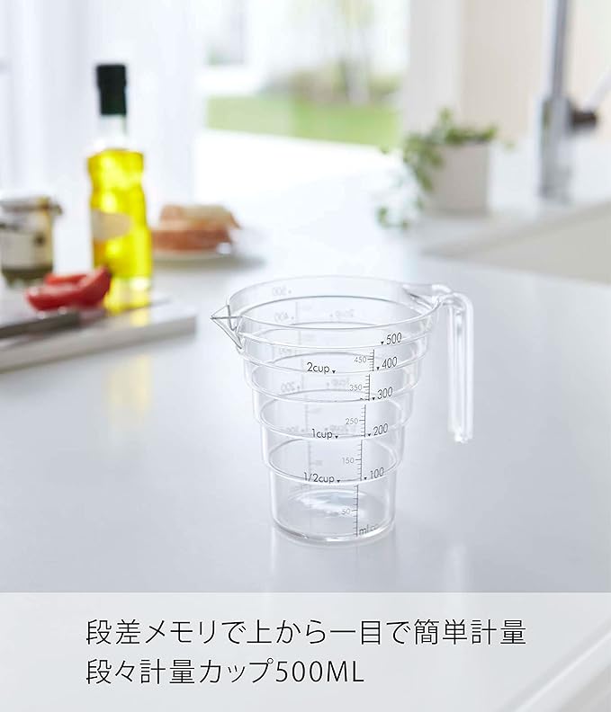 段差メモリで上から一目で簡単計量。熱に強く割れにくいトライタン樹脂製。200mlと500mlをスタッキングして収納できます。