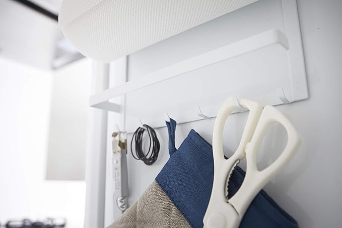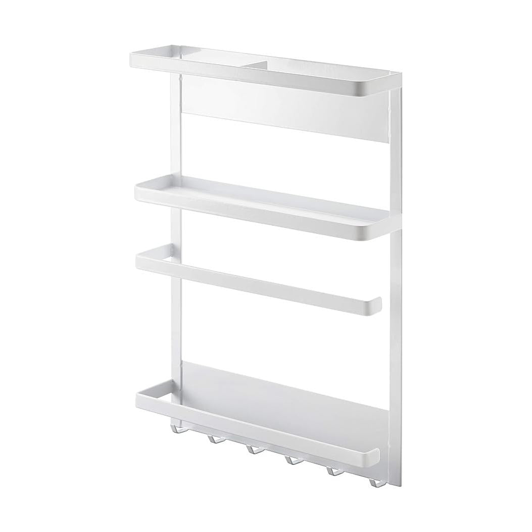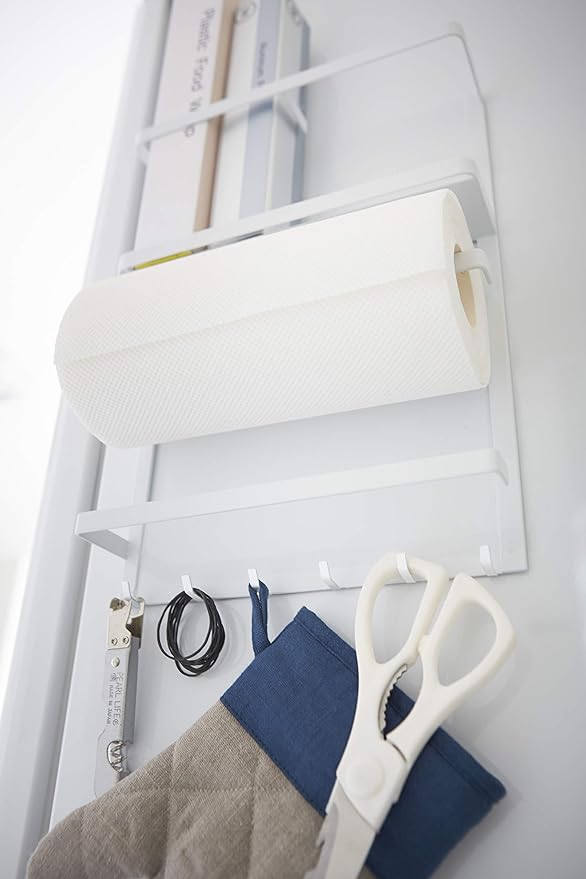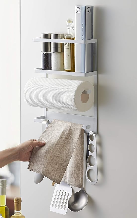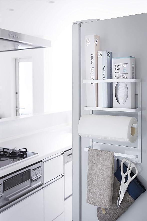 冷蔵庫側面に磁石で簡単取り付け。よく使うキッチン小物を一括収納。上段には、よく使うラップやアルミホイルを立てて入れることができます。中段には、キッチンペーパーや布巾を掛けられるホルダー付き。下段にはフックが付いているので、鍋つかみ、栓抜き、缶切りなどを吊るして収納できます。