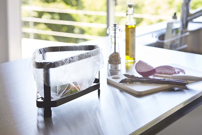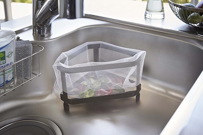 水切りネットを上からかぶせるだけの三角コーナー。シンク上や食卓などのミニゴミ箱としても便利です。ポリ袋をかぶせれば簡易ゴミ箱にもなります。ゴミによる目詰まりがなく水はけが良い構造。