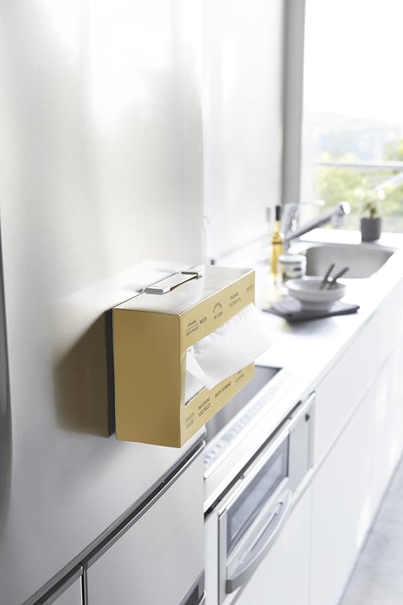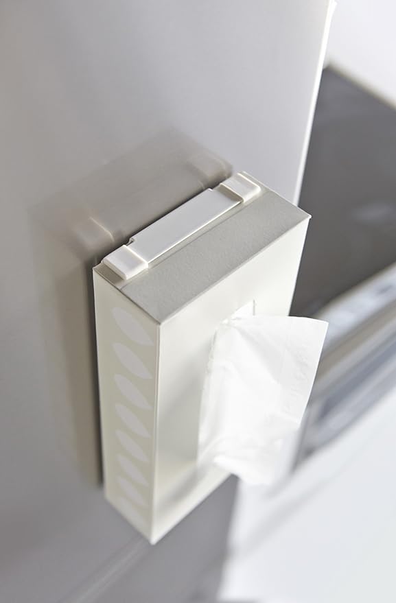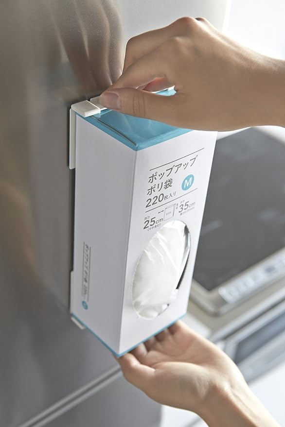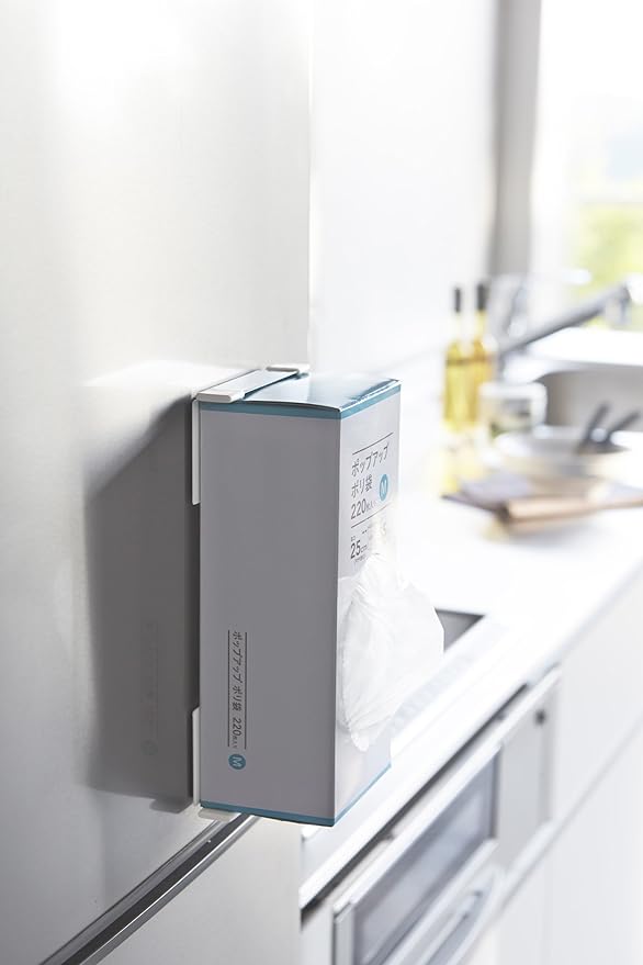 冷蔵庫の扉や側面に磁石で簡単取り付けのボックスホルダー。磁石のくっつく平らな面ならどこでも設置可能。ボックスを挟み込むだけで簡単設置。横向きでも固定可能。ポリ袋・ペーパータオル・ティッシュ箱をはさんで磁石で冷蔵庫側面などに簡単取り付け。