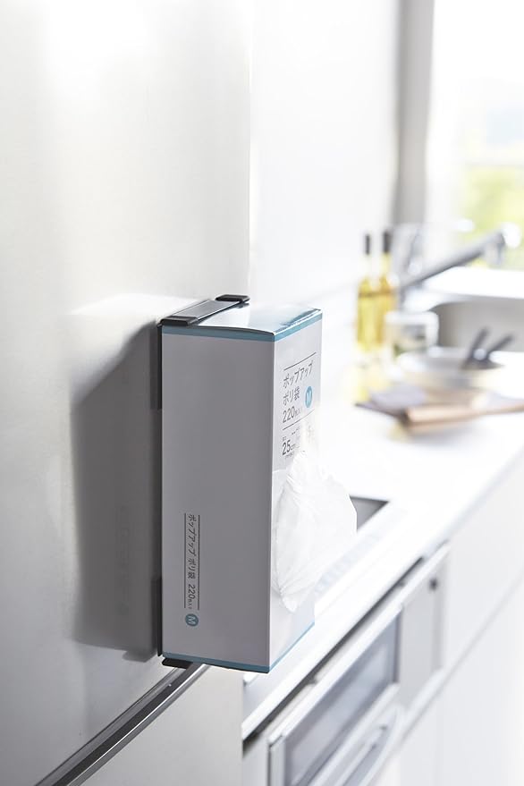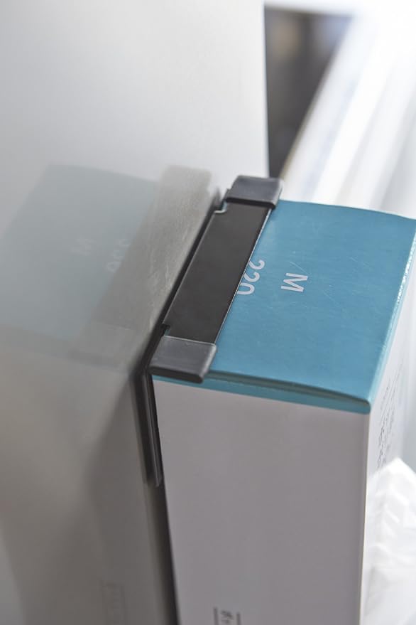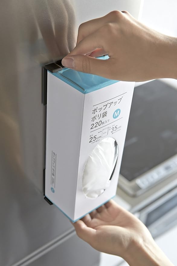 冷蔵庫の扉や側面に磁石で簡単取り付けのボックスホルダー。磁石のくっつく平らな面ならどこでも設置可能。ボックスを挟み込むだけで簡単設置。横向きでも固定可能。ポリ袋・ペーパータオル・ティッシュ箱をはさんで磁石で冷蔵庫側面などに簡単取り付け。