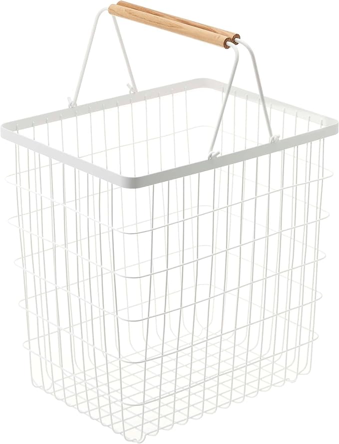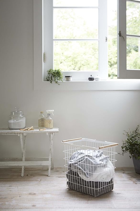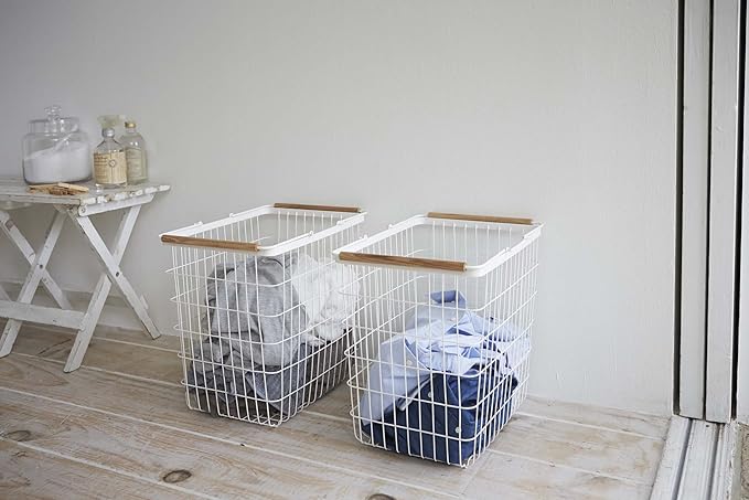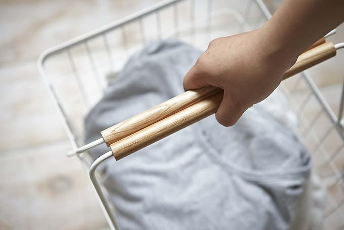 整列したスチールの線材とやさしい表情の木との組み合わせが美しいランドリーバスケットです。