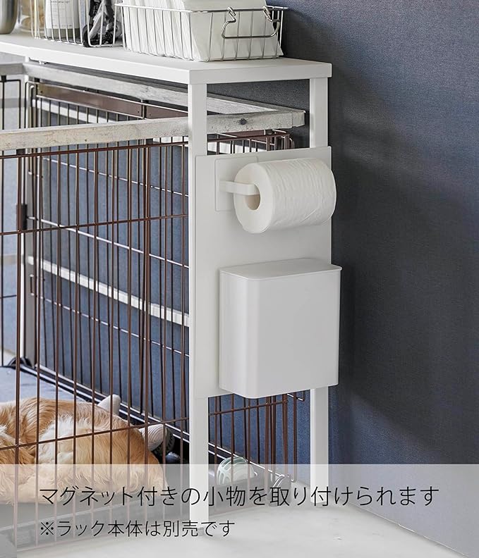 マグネット対応のスチール製。 オプションパーツで利便性UP 別売の『伸縮ペットケージ上ラック タワー』のサイドフレームに掛けてご使用いただけるオプションパーツです。場所を取らずに収納スペースを増設できるのでお部屋を圧迫しません。ペットの相手をしながら片手でサッと欲しいものが取れるのが便利です。※こちらの商品は『伸縮ペットケージ上ラック用 オプションパーツ』の商品となり、『伸縮ペットケージ上ラック タワー』の商品は別売です。インテリアになじむ2色のカラーバリエーション カラーは、明るい印象のホワイトと、スタイリッシュなブラックをご用意しました。お部屋のインテリアに合わせやすいシンプルなモノトーンカラーです。ケージや壁紙の色、カーテンやソファなどのファブリックに合わせてお好きなカラーをお選びください。※こちらの商品は『伸縮ペットケージ上ラック用 オプションパーツ』の商品となり、『伸縮ペットケージ上ラック タワー』の商品は別売です。自由な組み合わせでオリジナル収納に マグネット付きの小物を取り付けられるようになるので、ペットのお世話に必要なアイテムがペットケージに集できるように。トイレットペーパーとゴミ箱、ボックスティッシュとウェットティッシュなどが近くにあるとお世話がしやすくなります。簡単設置。 模様替えでの付け替えもラクラク 取り付けは『伸縮ペットケージ上ラック タワー』のサイドフレームの上下のバーに、収納パネル裏のフックを引っ掛けるだけの簡単設置。付け替えもラクにできるので、模様替えやペットのお世話アイテムの配置換えなどのときにも苦労せずスムーズに付け外しが可能です。ペット関連のアイテムはケージの側で一括収納 ペットのフードやおやつ、ペットシーツやブラシなどのお世話グッズをまとめてラックに収納。動物病院で貰ってきた予防薬なども一緒にしておけば飲み忘れも防げます。お散歩用のリードやおもちゃを置いておくのもおすすめです。※こちらの商品は『伸縮ペットケージ上ラック用 オプションパーツ』の商品となり、『伸縮ペットケージ上ラック タワー』』の商品は別売です。