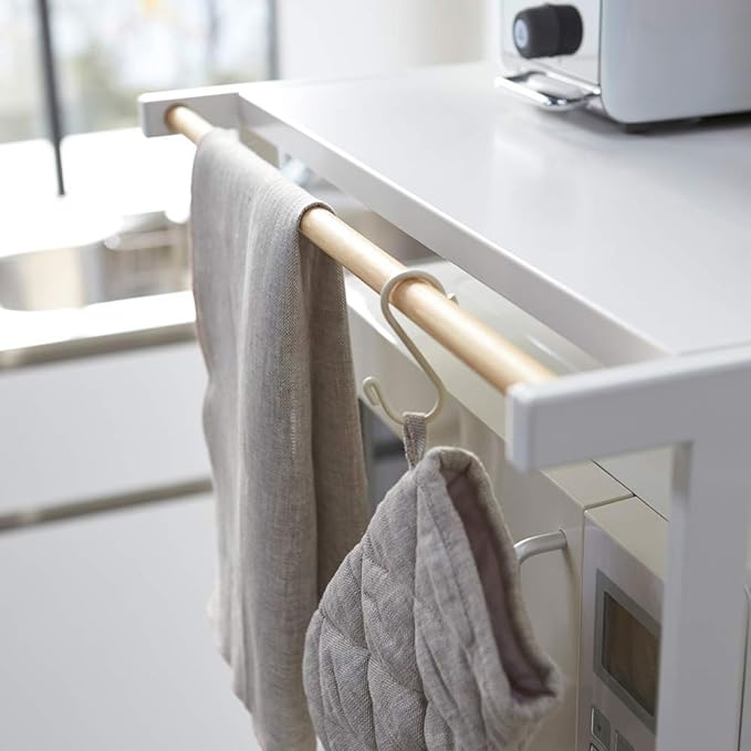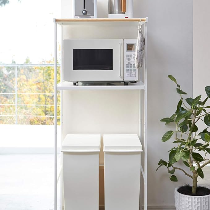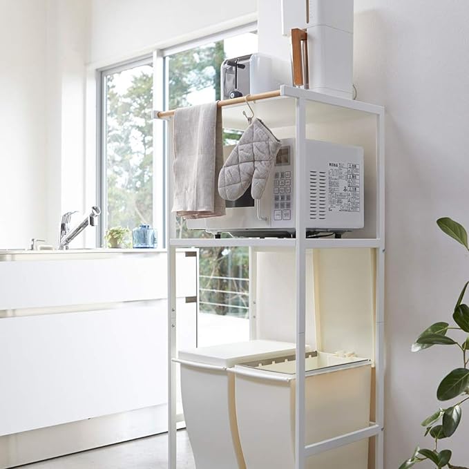 ペダル式のゴミ箱の上を有効活用できるラック。蓋をあけてもぶつかりません。ペダル式のゴミ箱がすっぽり収まるサイズ。便利な多目的バー付き。布巾や鍋つかみを掛けておくのに便利。電子レンジ・炊飯ジャー・トースター・コーヒーメーカーなどが置ける便利なラック。