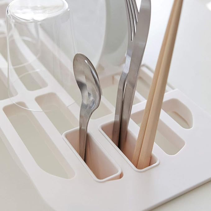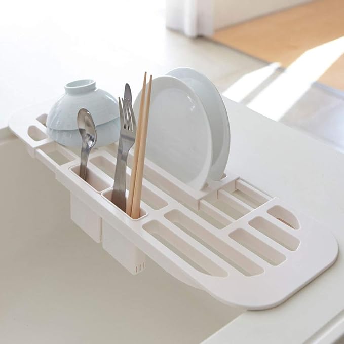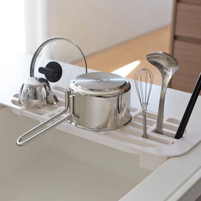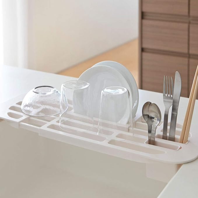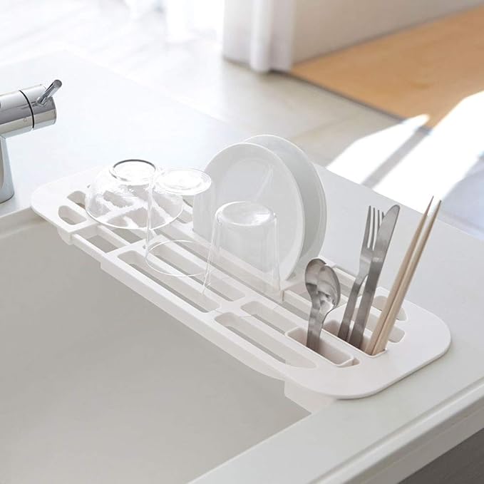 スリットを利用してお皿が立てられます。好きな位置に取り付け自在な、カトラリーポケット×2個付き。キッチンシンクのコーナーにぴったりフィット。延長棚として使えば調理スペースが広がります。シンクに合わせて38cm~58cmまで伸縮可能。アール形状がシンクの隅にぴったりフィットします。滑り止め付きで滑りにくくシンクも傷つけにくいです。シンクの角にぴったりフィットの伸縮水切りラック。