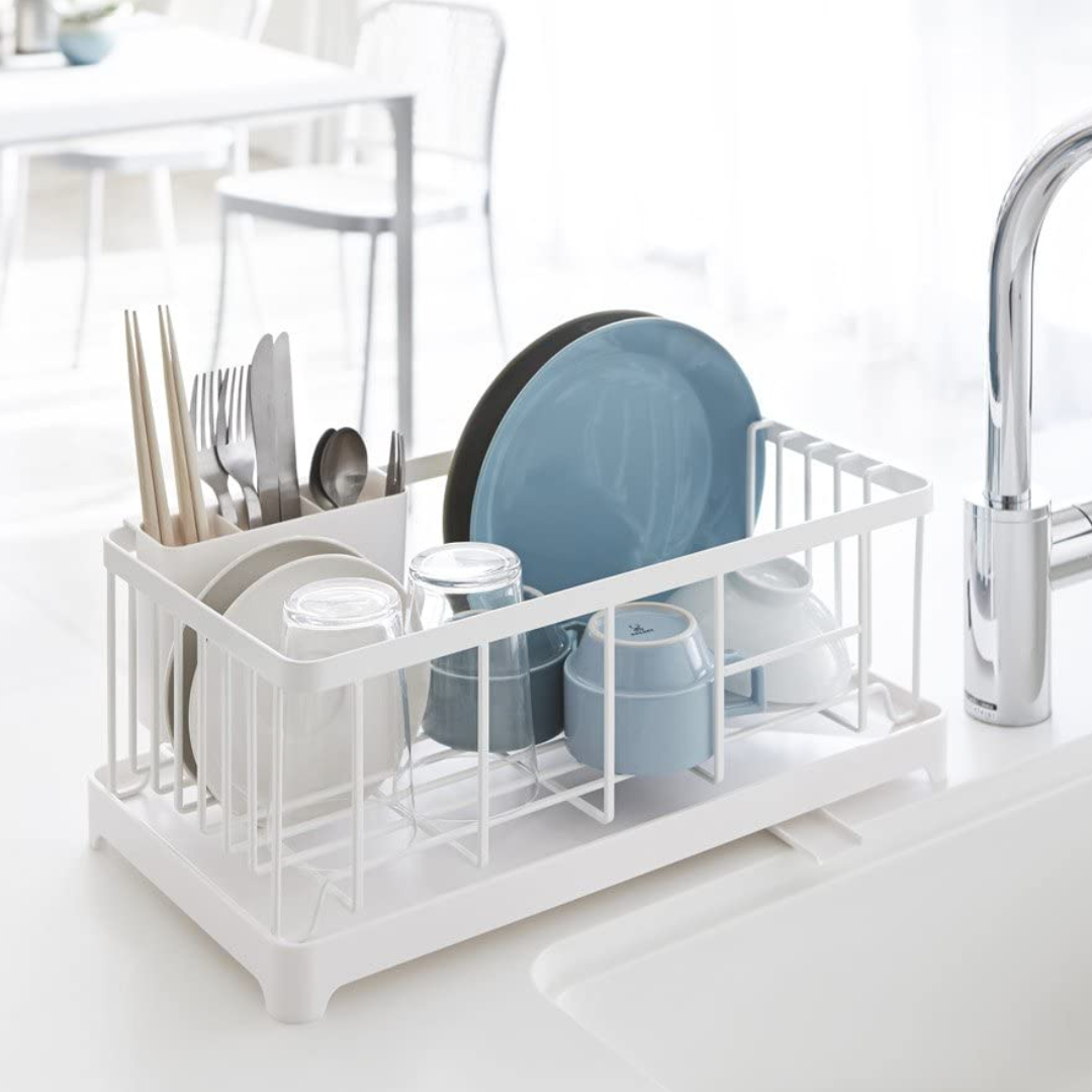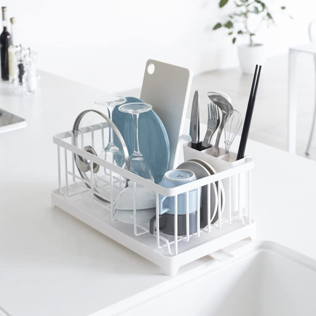 食器の水が直接シンクに流れる水切りラックです。よく使う、グラス・カップ・茶碗・カトラリー・調理道具などをたっぷり収納できます。