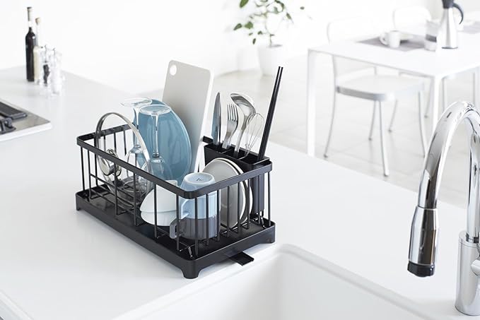 食器の水が直接シンクへ。レイアウトも自由自在。よく使う、グラス・カップ・茶碗・カトラリー・調理道具などをたっぷり収納。水はけは好きな方向で排水が出来ます。トレイにたまった水を直接シンクに流せる水はけ付き。排水できない場所でも使用可能。スリットを利用してお皿が立てられます。まな板・鍋ふたも立てられます。新発想の二層構造でお皿が立てやすく、置く面がフラットで食器が置きやすい構造。シンク周りへ、縦横自由にレイアウトが可能。菜箸・カトラリー・調理道具などを分別できる仕切り付き。シンク側に取り付ければバスケットの容量も増えます。