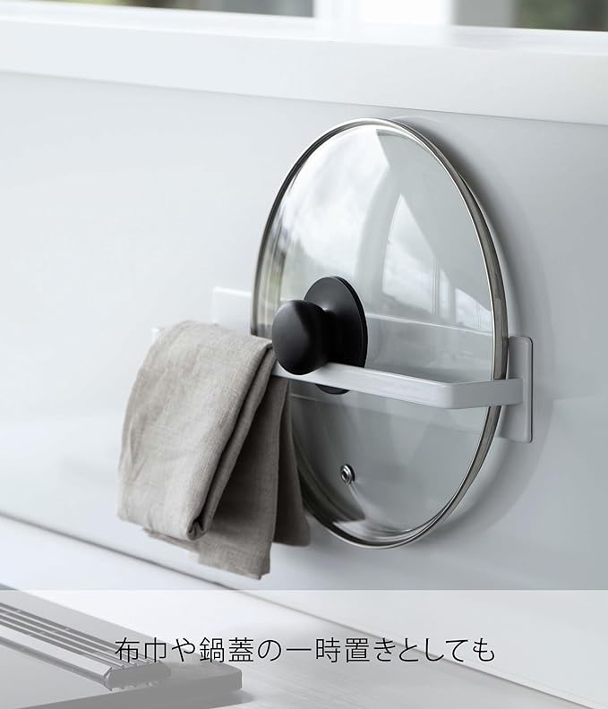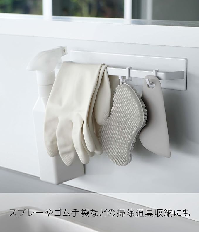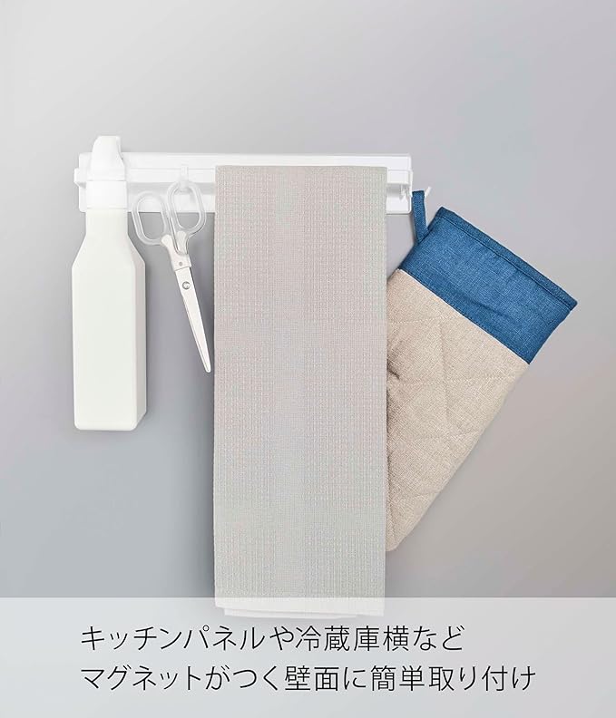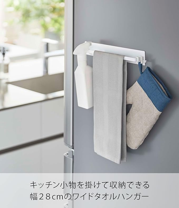 マグネットがつく壁面に簡単に取り付け。キッチン小物を掛けて収納できる幅28cmのワイドタオルハンガー。大き目のタオルを掛けられて便利。掛ける部分が閉じているので、タオルが落ちにくい設計です。スプレー・スポンジ・スクレーパー・ゴム手袋などの掃除道具の収納や布巾・鍋蓋などの収納にも。付属のフックでキッチン小物を掛けて収納できます。