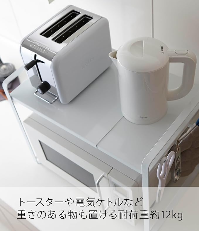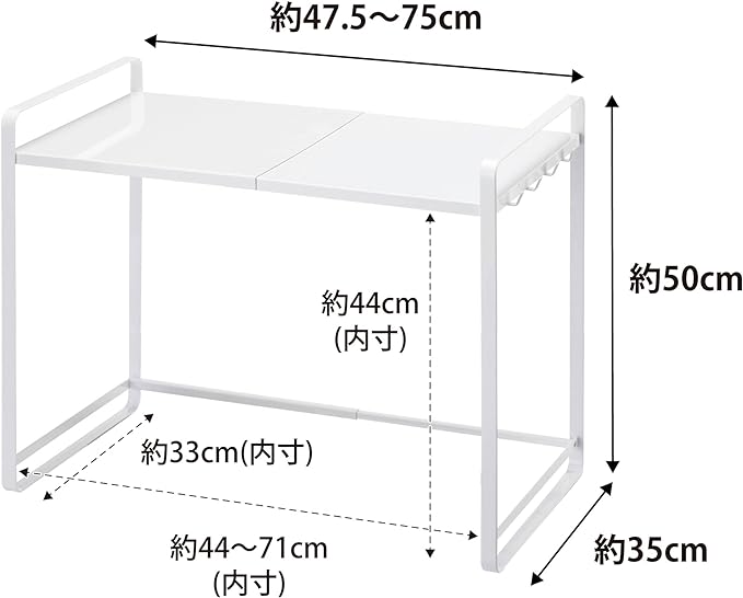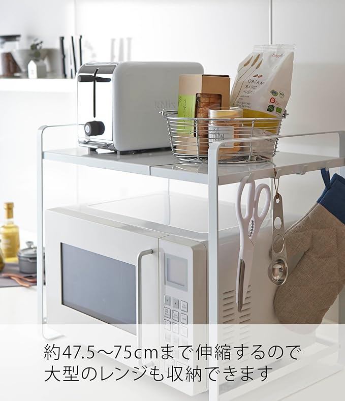 シンプルで使いやすい約47.5~75cmまで伸縮可能な電子レンジ収納ラックです。大型レンジも収納可能。