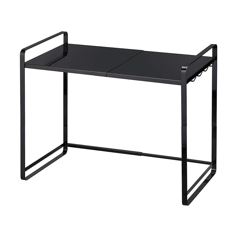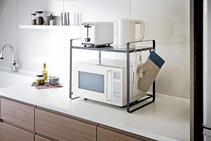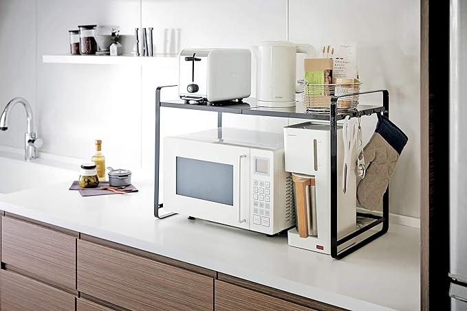 シンプルで使いやすい約47.5~75cmまで伸縮可能な電子レンジ収納ラック。大型レンジも収納可能。