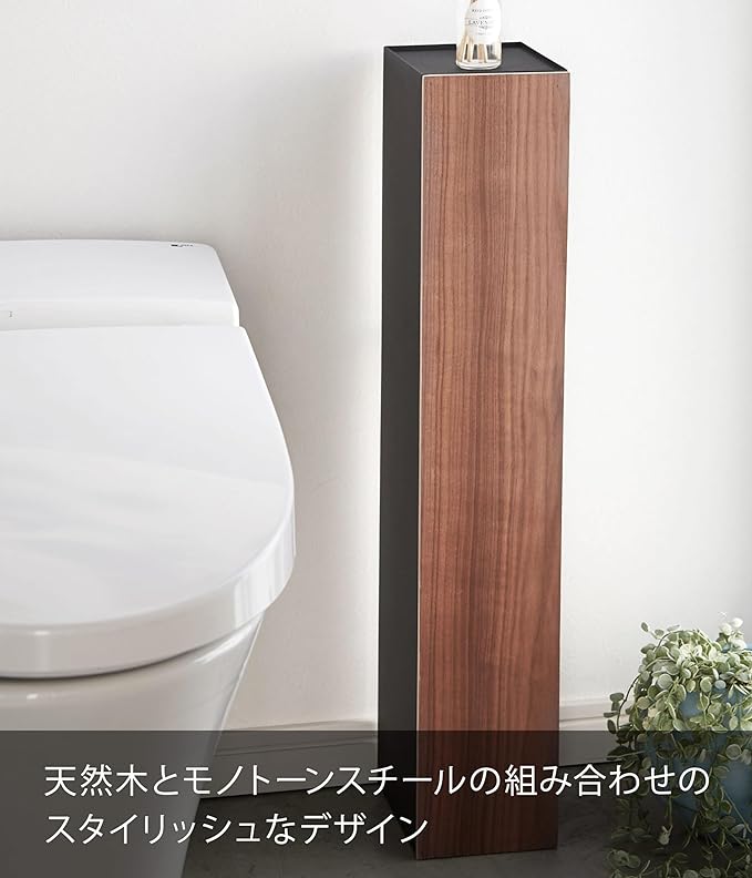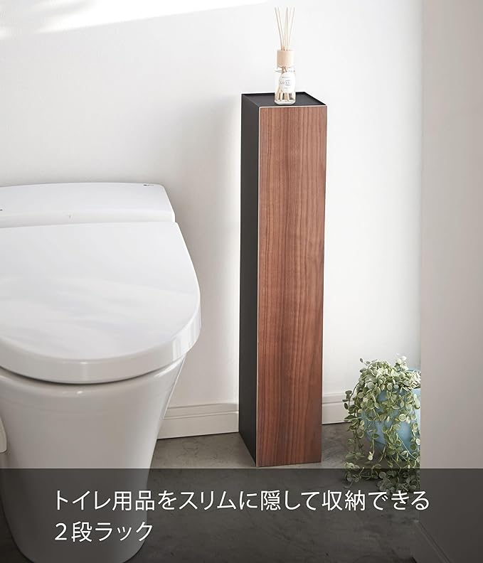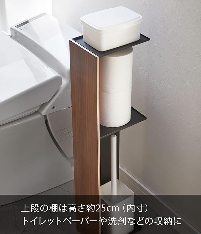 美しい木目でインテリア性のあるスタイリッシュなデザインのスリムトイレラックトイレブラシやトイレ用洗剤など掃除用具からトイレットロールペーパーなどを隠して一括収納
