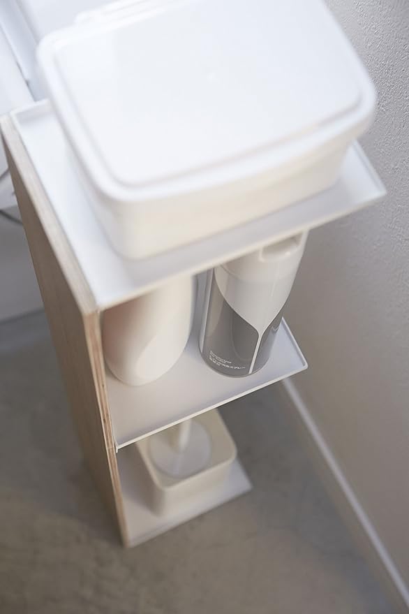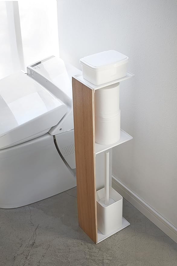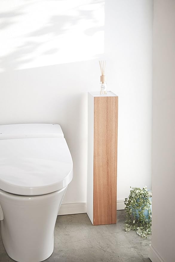 美しい木目でインテリア性のあるスタイリッシュなデザインのスリムトイレラックトイレブラシやトイレ用洗剤など掃除用具からトイレットロールペーパーなどを隠して一括収納