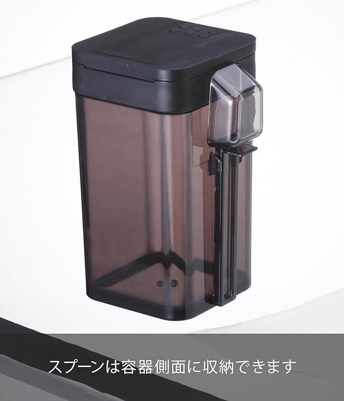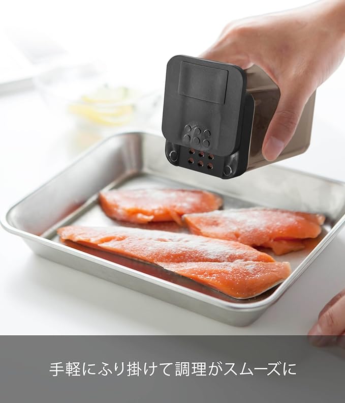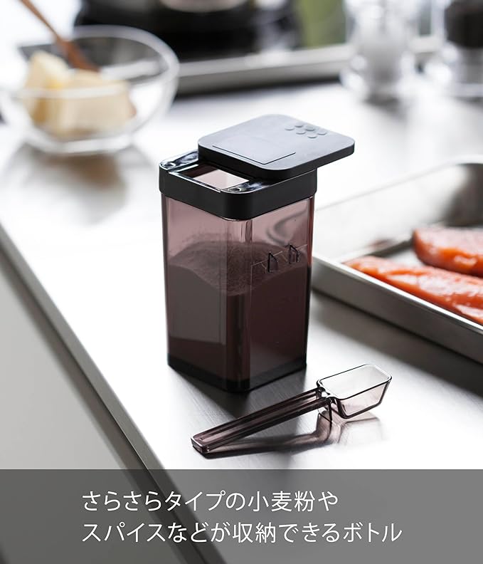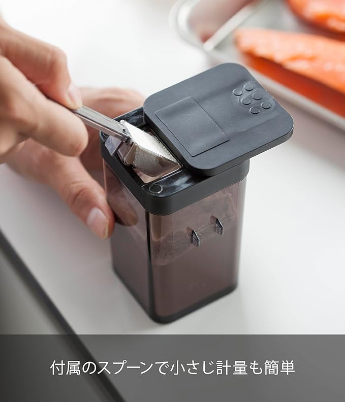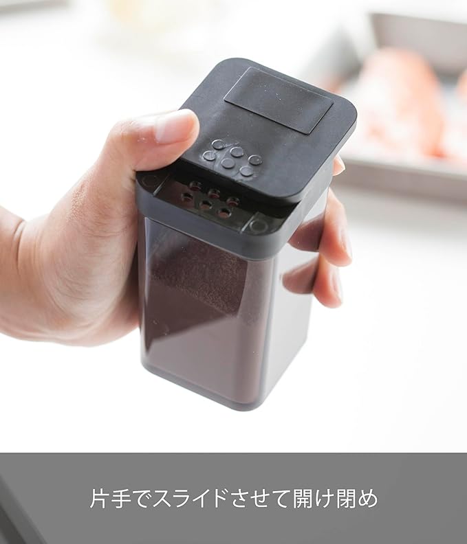 さらさらタイプの小麦粉やスパイスなどを簡単ふり掛け。小さじスプーンは容器に収納。小さじスプーン(5ml)付きで、すり切りも可能。片手で操作できるので調理もスムーズ。パーツはすべて分解して洗えるので、お手入れ簡単。使いたい量が片手で調節できる調味料保存容器。詰め替え用のさらさらタイプの小麦粉や塩コショウ・スパイス等をふり掛けられます。前後にフタをスライドさせ、分量を選んで出すことができます。四角い形状で引き出しなどに無駄なくすっきり収納できます。