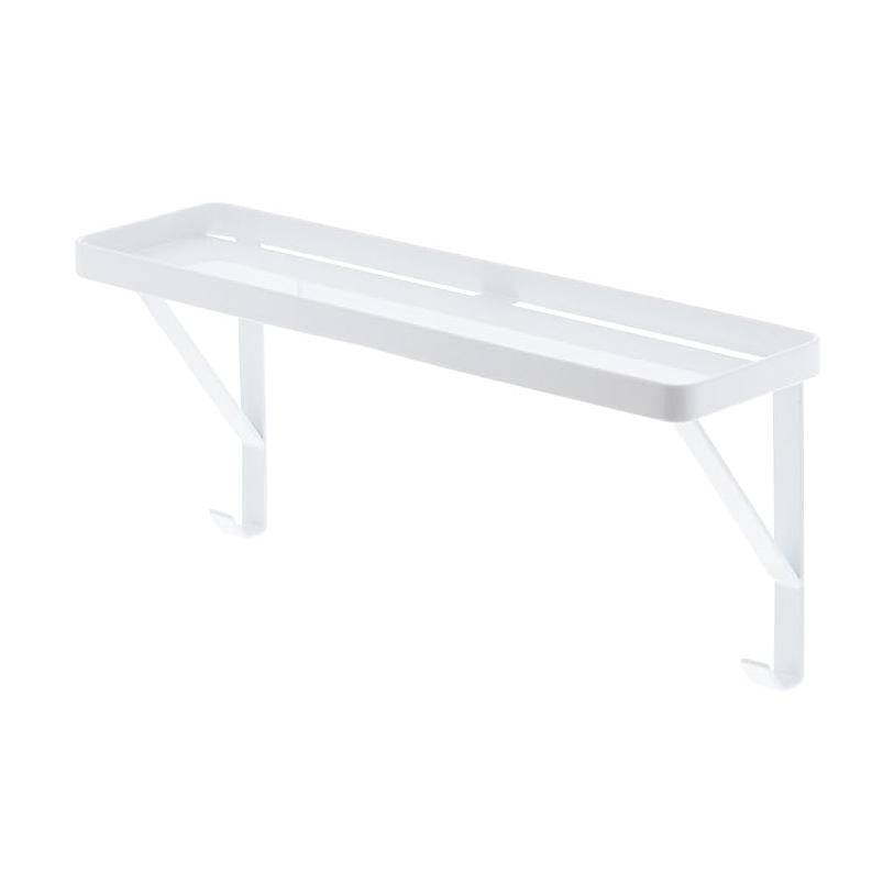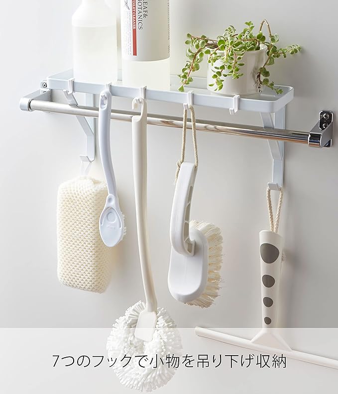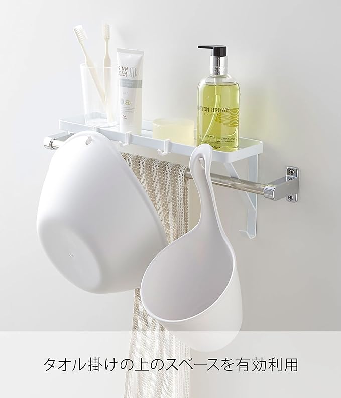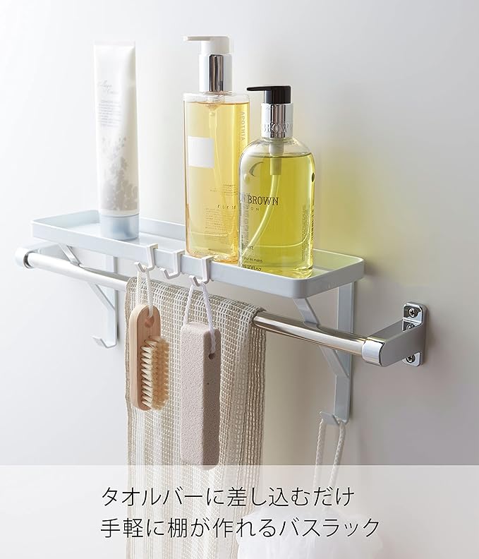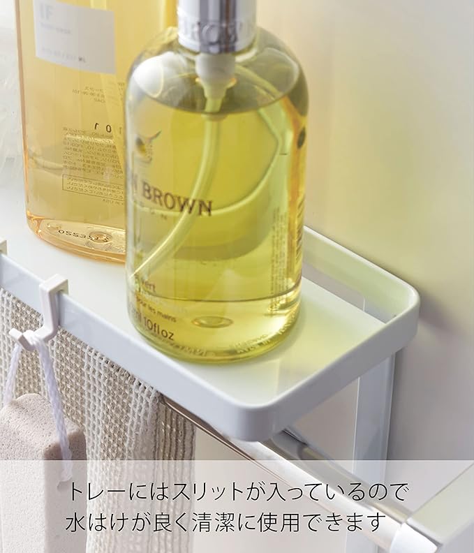 タオルバーに差し込むだけで簡単に設置できるシェルフ。タオル掛けの上のスペースを有効利用。置き場所に困るバス小物の収納や洗濯小物やお風呂掃除道具の収納にも。水はけの良いミゾ付きトレー構造。芳香剤を置いたり、ディスプレイ棚としても使えます。
