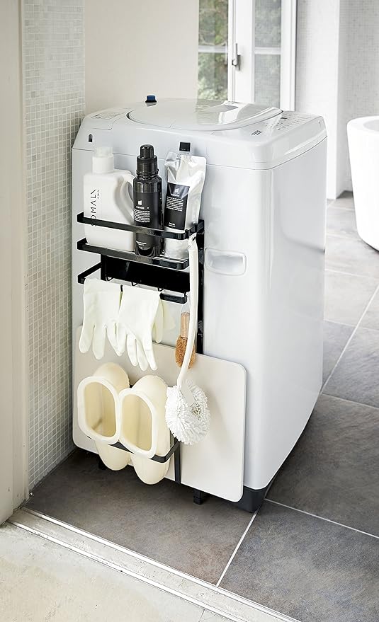 強力マグネットで洗濯機の側面に着けるだけ。便利な収納ラック。珪藻土マットやバスブーツ、洗濯用洗剤、洗濯ネット、掃除用具、小物などを一括収納。付属のフックでお好みの位置に掃除用具など引っ掛けておくのに便利です。