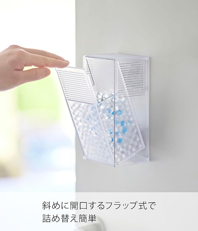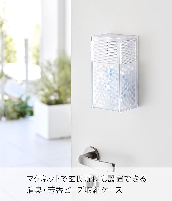 玄関扉や下駄箱に設置可能。サッと開閉できて詰め替え簡単。消臭・芳香ビーズ収納ケース。玄関やトイレなど場所や用途に合わせて選べる2通りの使い方。マグネットで玄関扉に取り付けたり、下駄箱上に置いても使用できます。ニオイが気になる靴の近くに置いても場所をとりません。斜めに開口するフラップ式でラクラク開閉。内側の容器は簡単に分解できて洗えます。