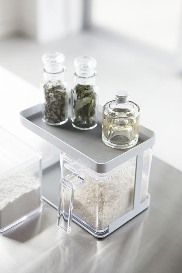 すり切り板で簡単に計量できる調味料ストッカー2個セット上段は市販のボトルなどを収納可能。ガード付きで安心下段はフラット設計上下にマット付きで汚れてもサッと洗えます調味料ストッカータワーLサイズが2つ、Sサイズ(別売)が3つ収納できます付属の小さじスプーン(5ml)をすり切れます。各調味料ストッカーに1本付属。使わない時はスプーンを本体に収納パーツはすべて分解して洗えます分別シールと書き込みができる無地シール付き蓋は片手で開けてそのままキープ