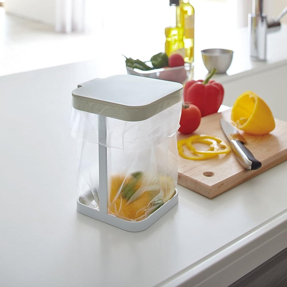 調理中にでるゴミをその場で捨てられる卓上ゴミ箱です。 袋をかけるだけで蓋付きなので、スタイリッシュで衛生的なアイテムです。シンクの中に入れてもすっきりおさまるコンパクトサイズです。