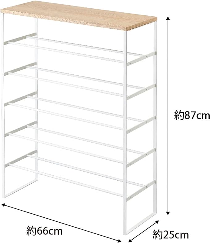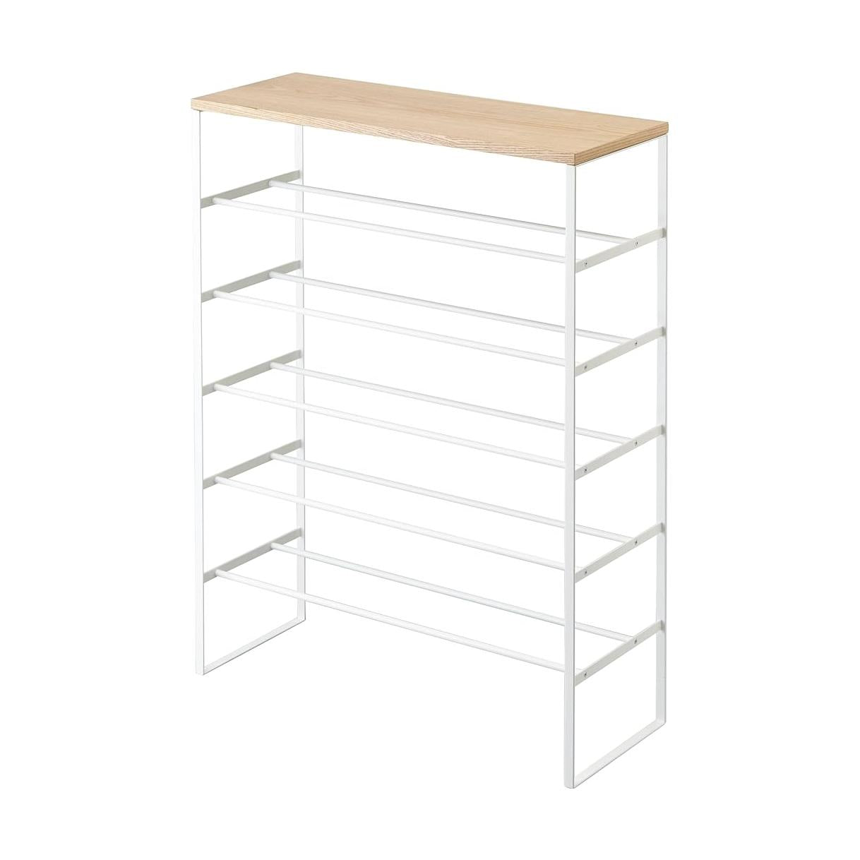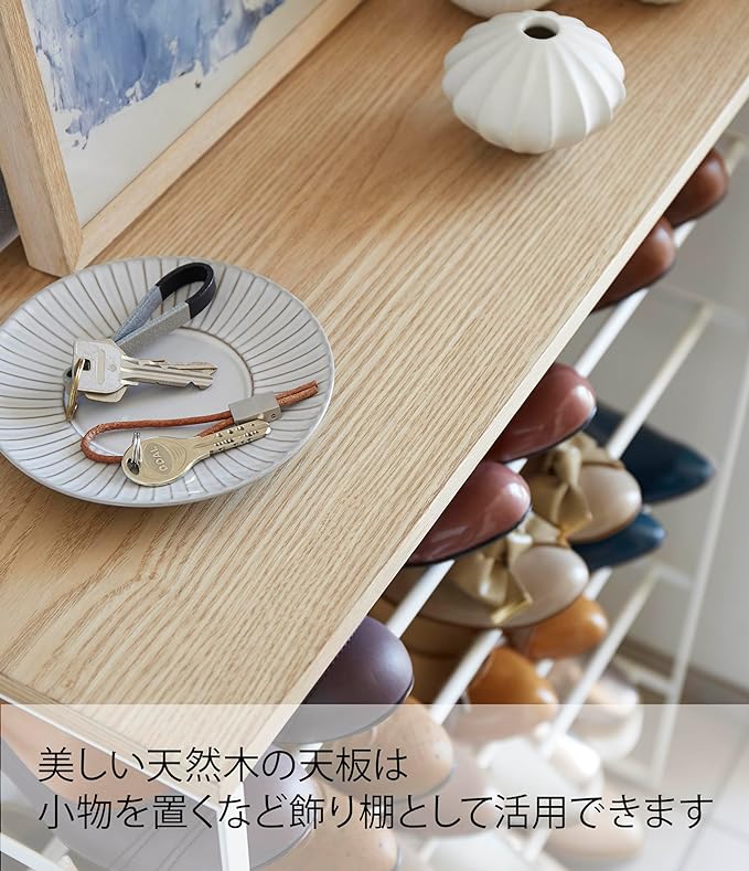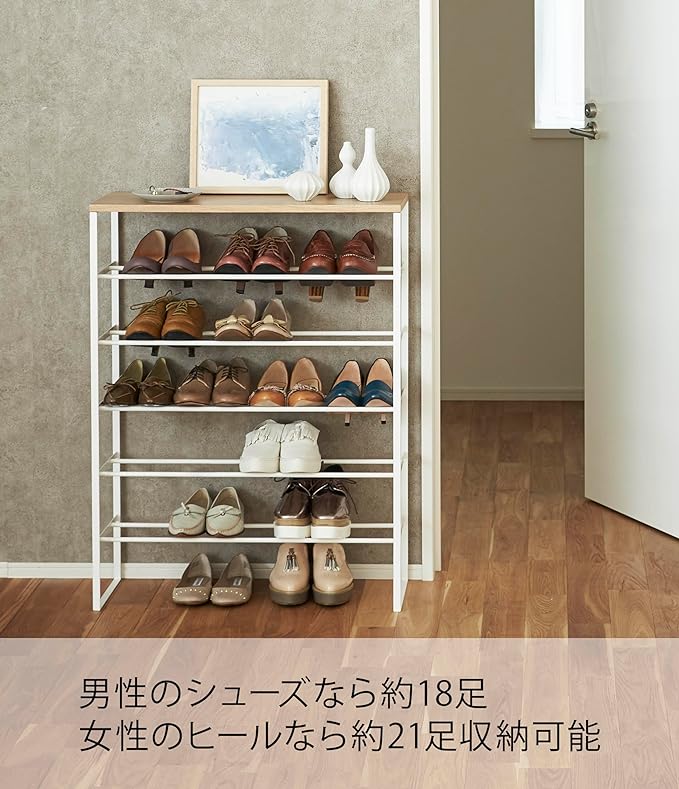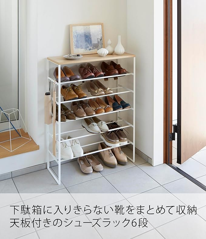 たっぷり収納。散らかる靴をおしゃれにまとめるシューズラック 下駄箱から溢れた靴をしっかり収納でき、おしゃれさも光るシューズラックです。ラックは6段もあるので、男性シューズなら18足、女性のヒール類なら21足と、たっぷり収納ができます。家族が多く、玄関に靴が溢れているというご家庭にぴったり。フックが付属していて、ラックの横に設置すれば靴ベラや傘、掃除用具など小物の収納スペースも作れます。さらに、上部は天板仕様なので物置としての使用も可能。花や写真などを飾って、おしゃれな空間づくりをするのもおすすめです。機能面に優れているだけでなく、玄関を圧迫しない洗練されたデザインも魅力。美しく見せるのが難しい玄関を、すてきにまとめてワンランクアップしてくれます。ホワイトとブラックの2色から選べる カラーバリエーションは清潔感のあるホワイトと、スタイリッシュなブラック。どちらも天板には天然木が使用され、温もりを感じます。玄関の壁やドアのカラーに合わせても良いですし、どんな場所にもなじむシンプルなデザインなので、好みのカラーで選ぶのもおすすめです。