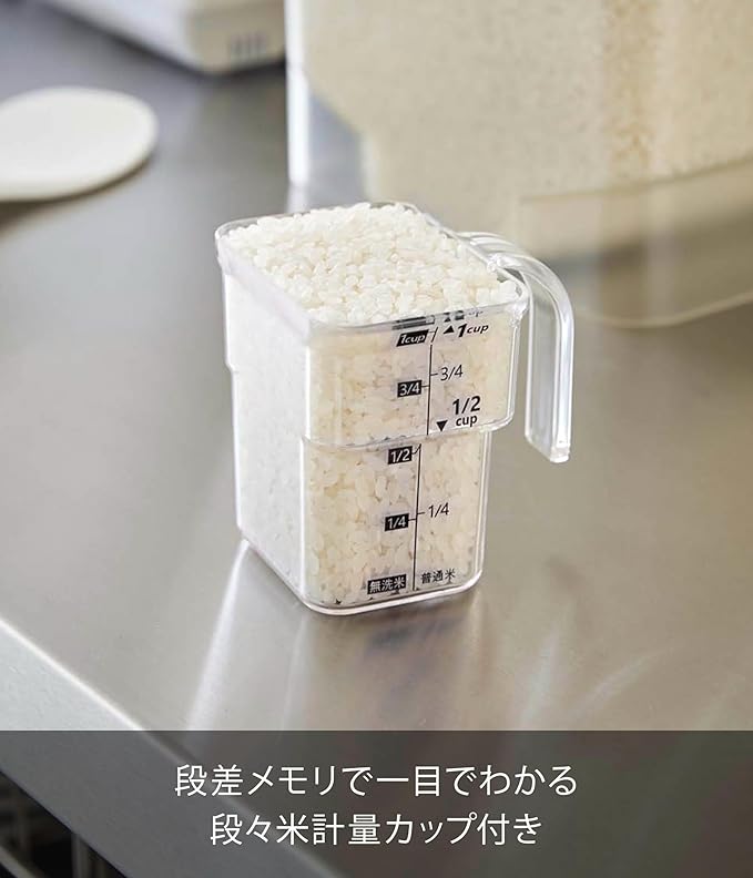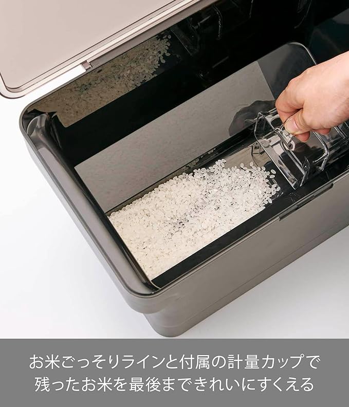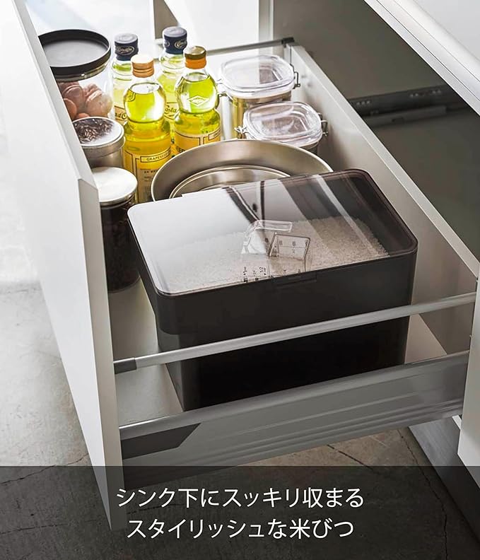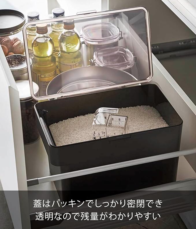 システムキッチンの引き出しに合うスタイリッシュな米びつ。パッキンでしっかり密閉され、お米が最後まできれいにすくえます。蓋をパチッとロックしておけば、お米を湿気と酸化から防いでくれます。炊飯器の横に置いておけば作業もスムーズ。蓋は全面が開くからお米がすくいやすく、残量が分かりやすい透明蓋。底の形が付属の計量カップにピッタリとフィットするから、残りのお米をきれいにすくい取ってくれます。