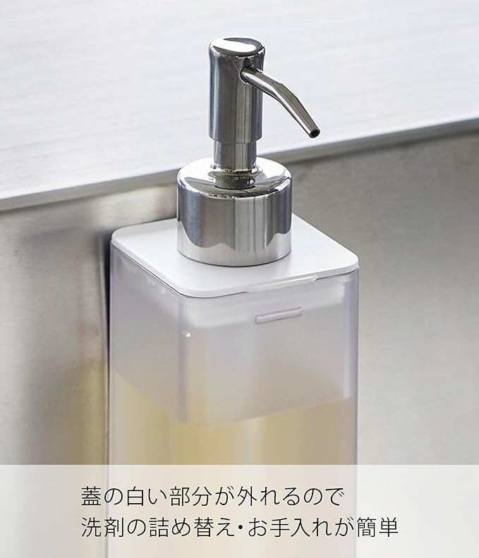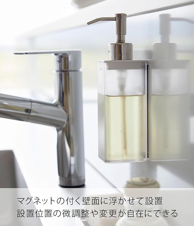 マグネットで浮かせて設置できるディスペンサー。マグネットで壁面に浮かせて設置できるので衛生的。壁面につけたままポンプを押せます。蓋が外れるので詰め替えが・お手入れが簡単。