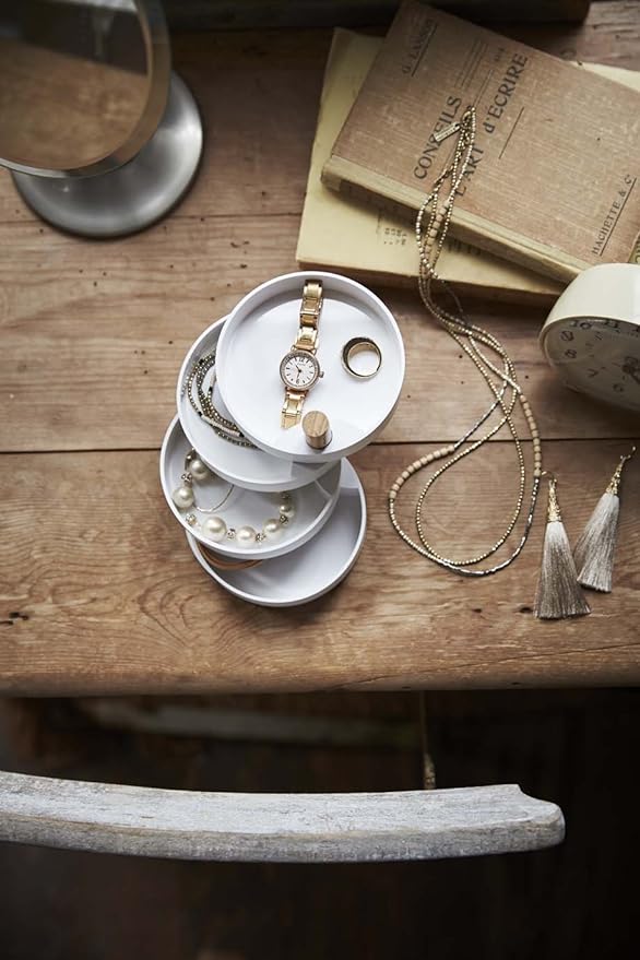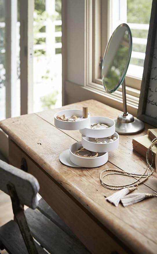 4段のトレーにアクセサリーやコスメを収納できるアクセサリートレー。回転自由で取りやすく、美しいフォルムです。