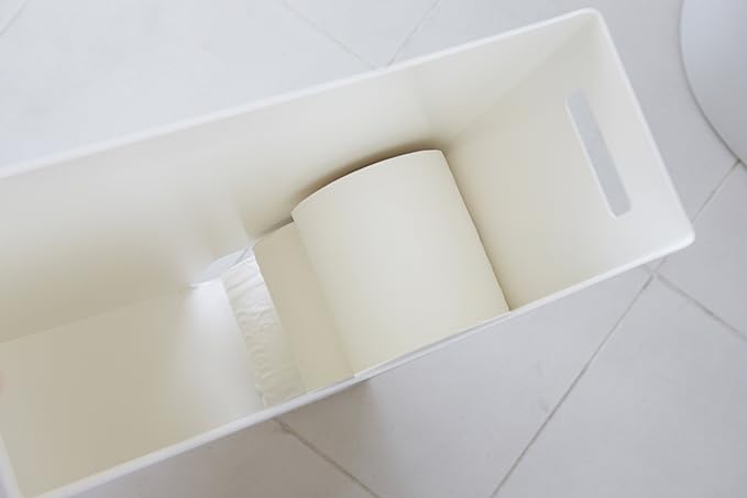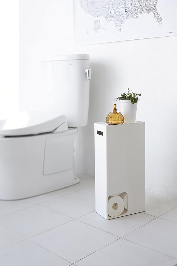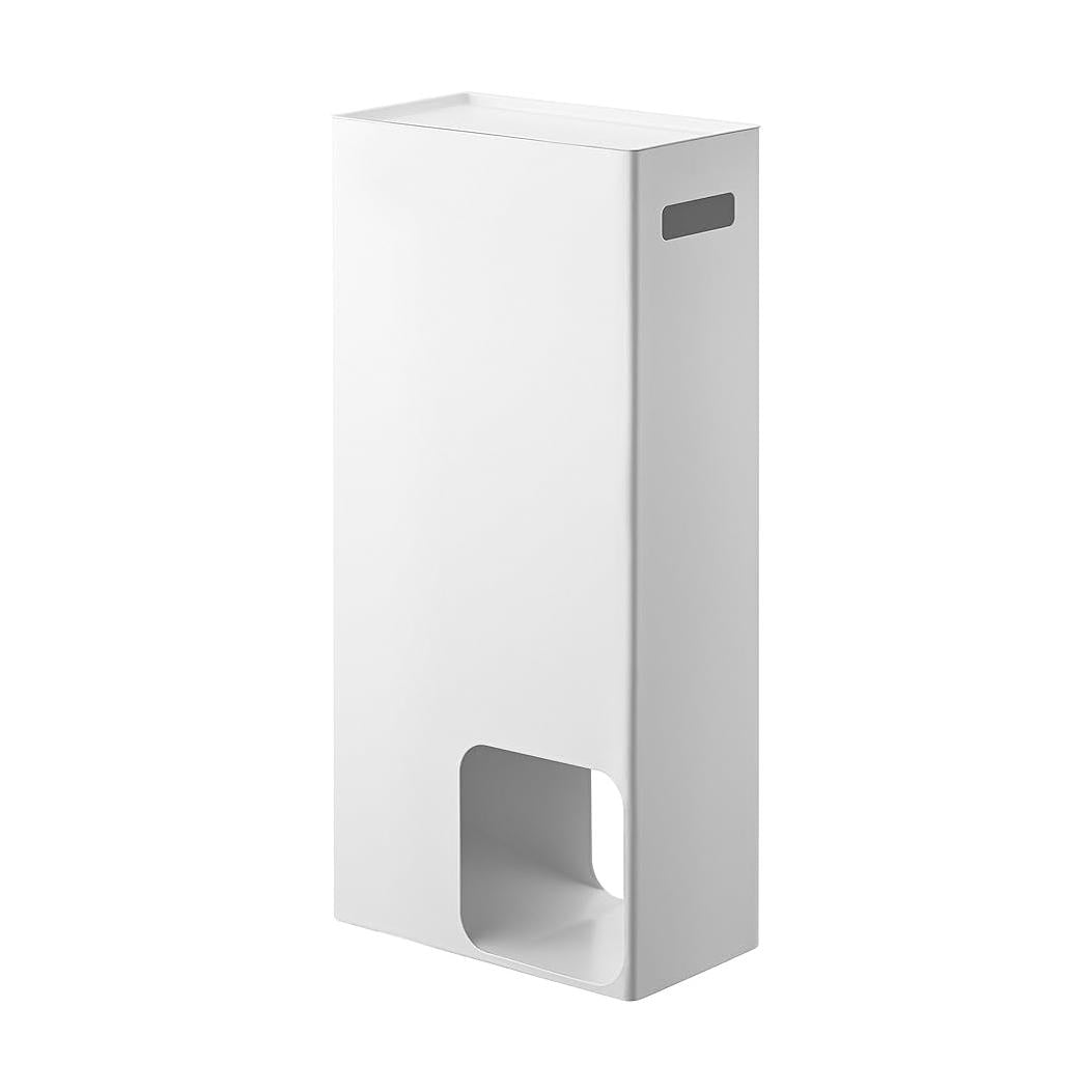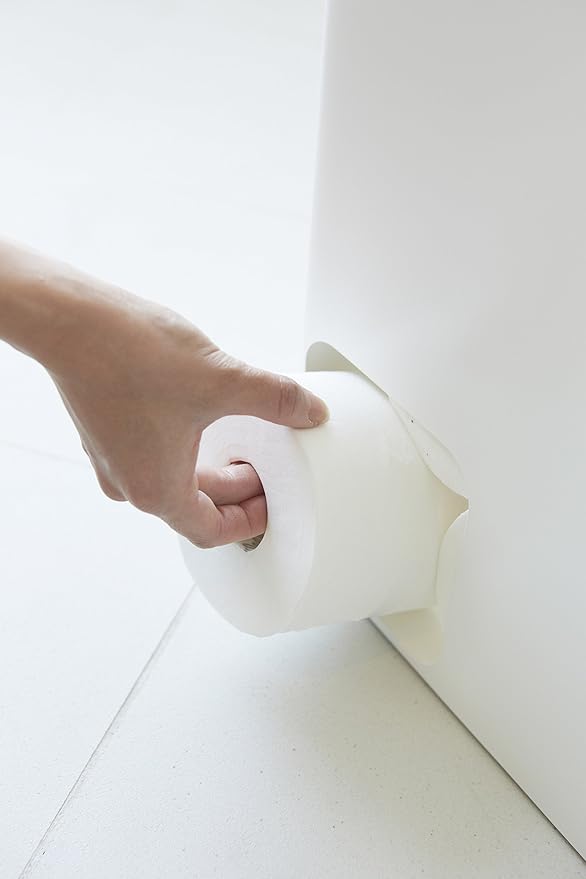 トイレットペーパー8ロールを美しく隠してスリムに収納。1ロール取り出すと次のロールが出てくる便利な構造。コーナーに置けば存在を主張せず、空間に美しくなじみます。取り出し口は両面にあるので設置の向きに困ることもありません。蓋のトレーには芳香剤や消臭スプレーやスマートフォンなどが置けます。取っ手穴が付いているので移動や掃除もラクラク。