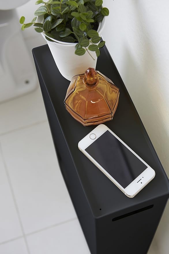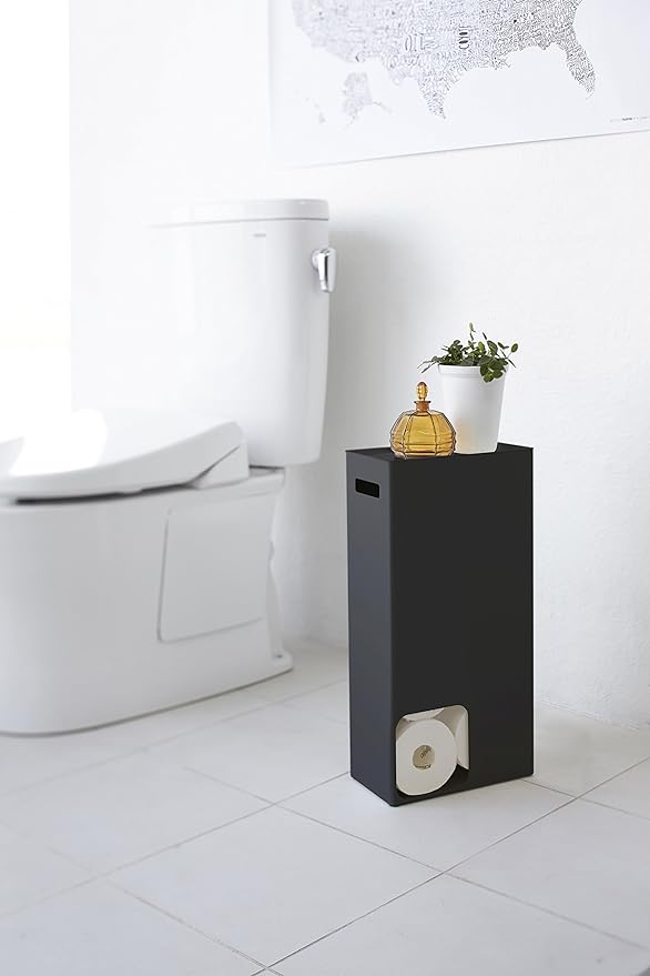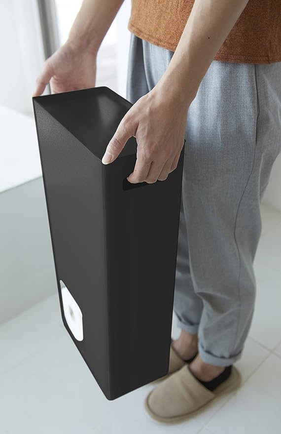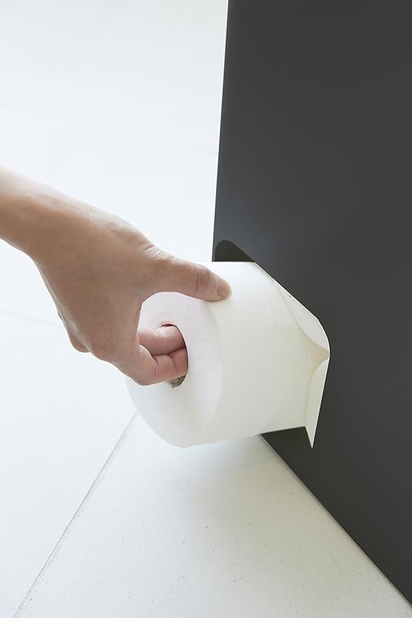 トイレットペーパー8ロールを美しく隠してスリムに収納。1ロール取り出すと次のロールが出てくる便利な構造。コーナーに置けば存在を主張せず、空間に美しくなじみます。取り出し口は両面にあるので設置の向きに困ることもありません。蓋のトレーには芳香剤や消臭スプレーやスマートフォンなどが置けます。取っ手穴が付いているので移動や掃除もラクラク。