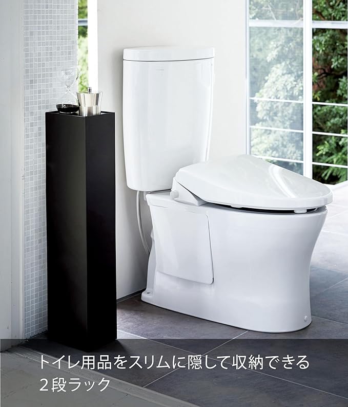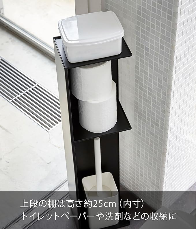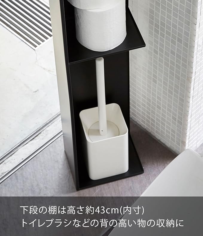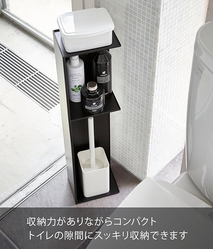 インテリア性のあるスタイリッシュなデザインのスリムトイレラック。トイレブラシやトイレ用洗剤など掃除用具からトイレットロールペーパーなどを隠して一括収納
