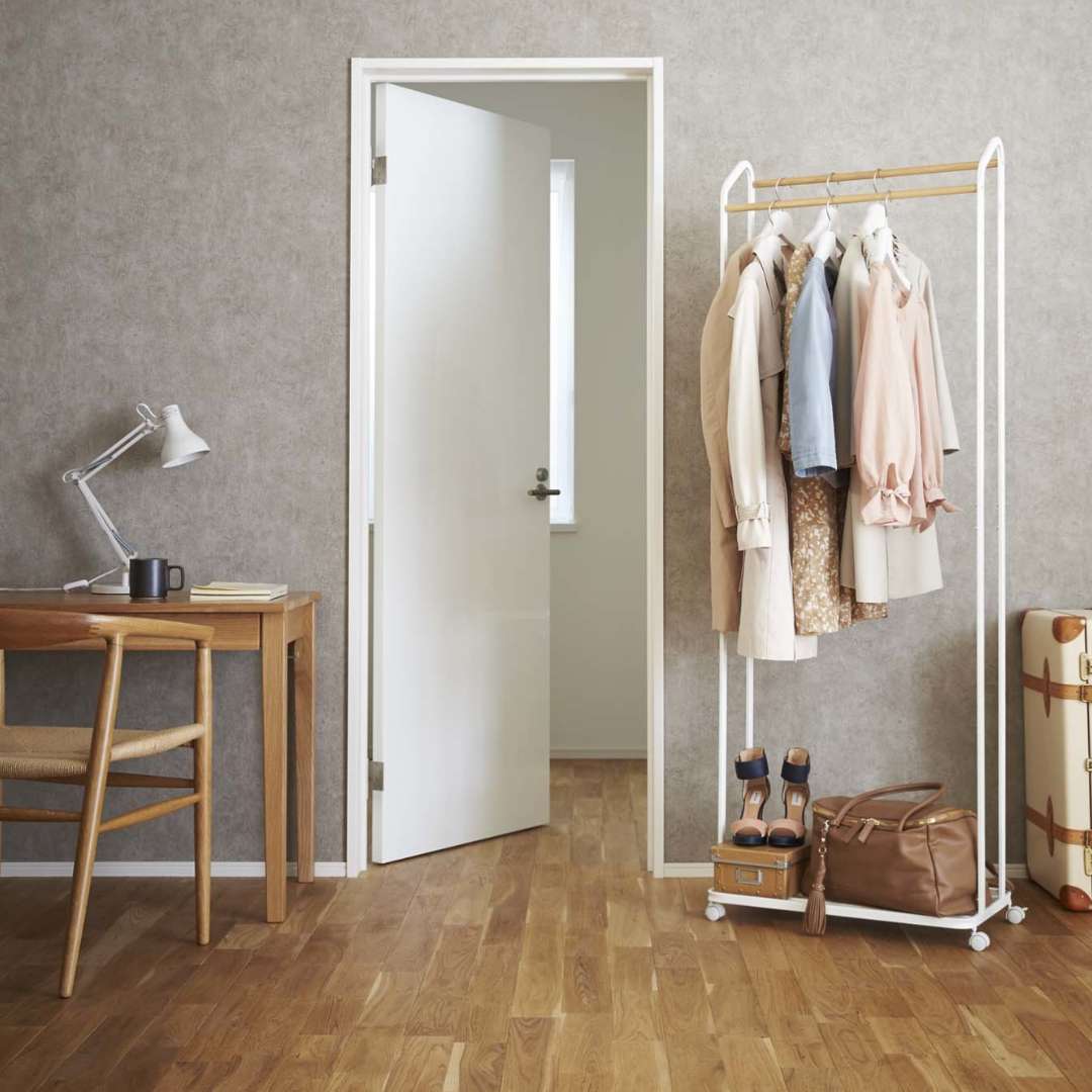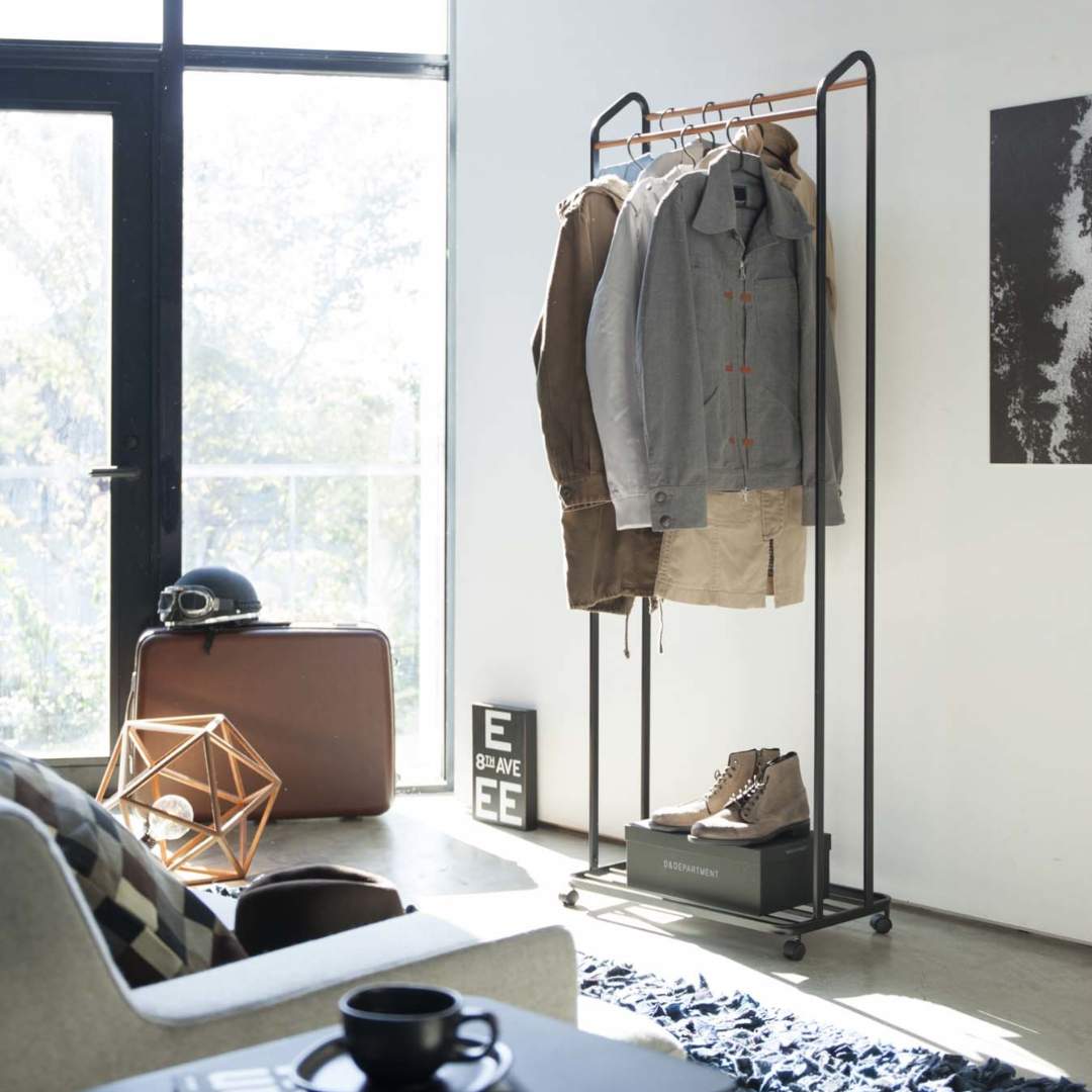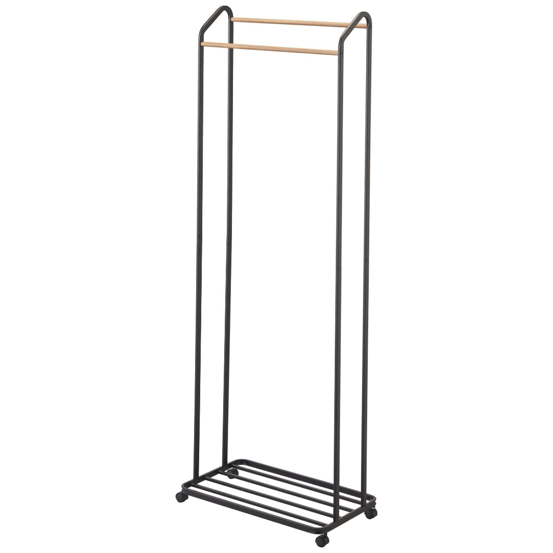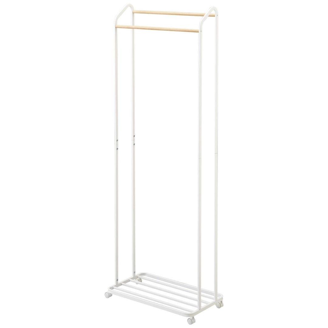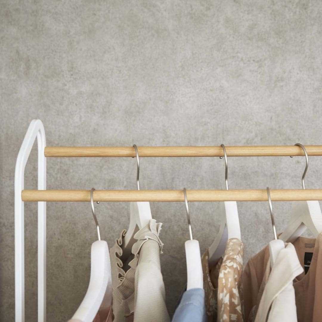 天然木のバーがおしゃれなキャスター付きハンガーラック スチールの本体に天然木のバーがおしゃれなアクセントになった、キャスター付きのハンガーラック。172.5cmと高さのあるデザインで、ロングコートやワンピースも裾を床に付けることなく掛けられます。2段になっているから、お気に入りの洋服をたっぷり収納できるのもポイント。バーはそれぞれ6kgまで耐えられるので、重みのある冬物アウターも安心して掛けられます。台座には、小物類をまとめた収納かごや置き場所に困りがちな通勤バッグなどを収納可能。耐荷重は5kgなので、書類が入った重たいカバンもそのまま置けます。場所を変えたいときもラクラク移動できる便利なキャスター付き。シンプルなデザインでどんな空間にも自然になじむのが魅力です。ホワイト・ブラックの2色展開 カラーバリエーションは、ナチュラルで明るい印象のホワイトと、スタイリッシュでメンズライクな空間にも合わせやすいブラックの2種類です。お部屋の雰囲気や好みに合わせて選んでみてください。
