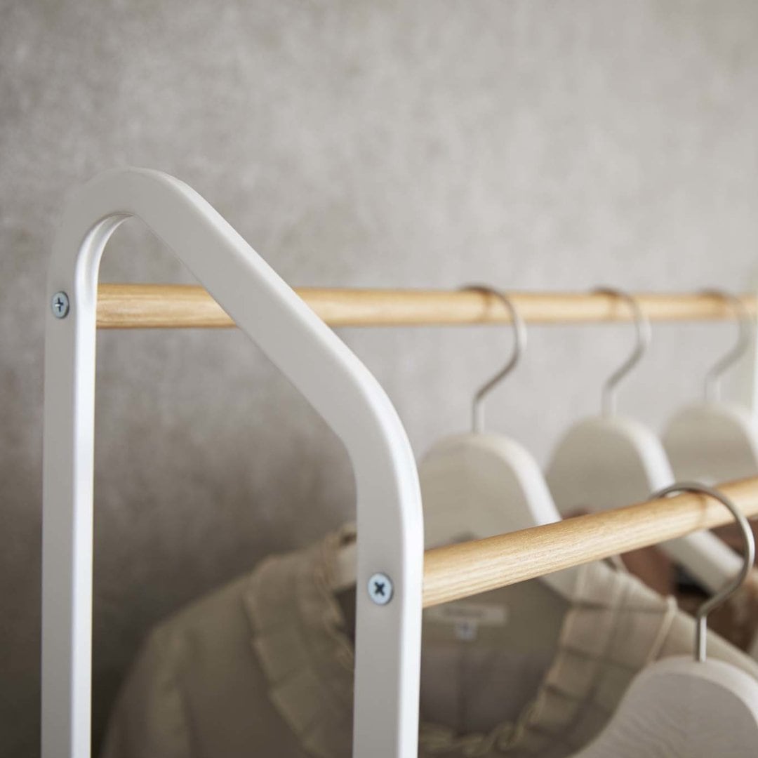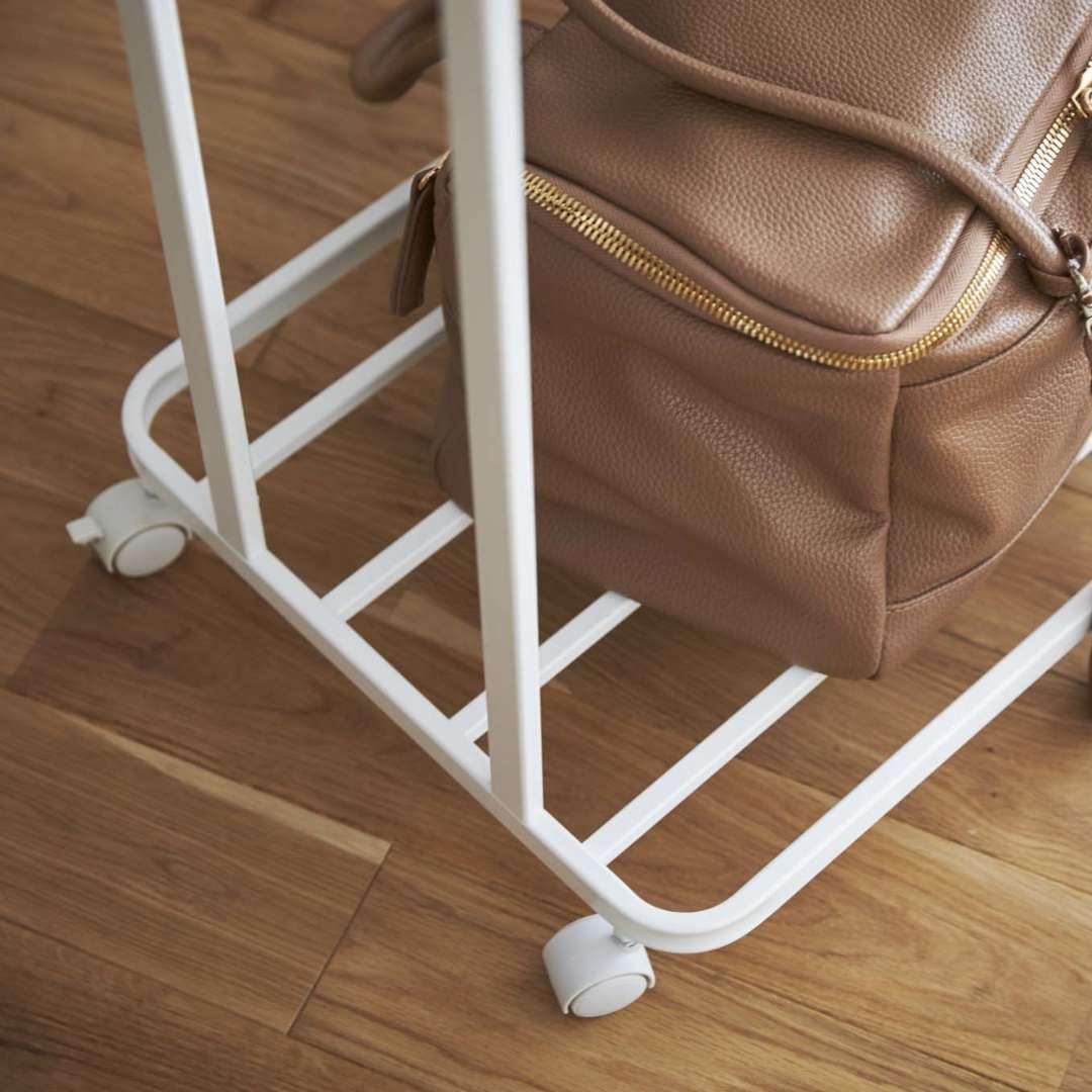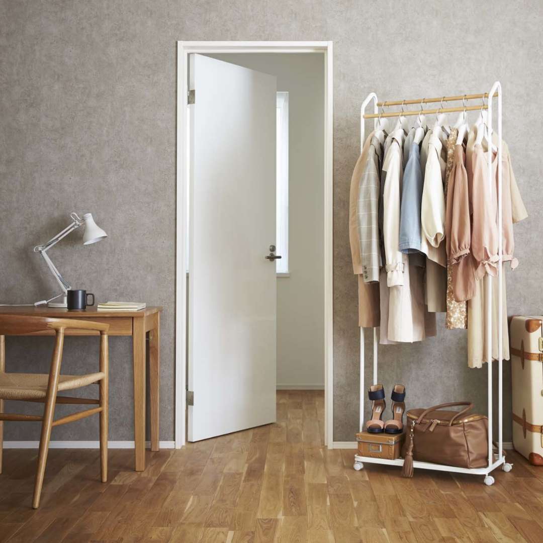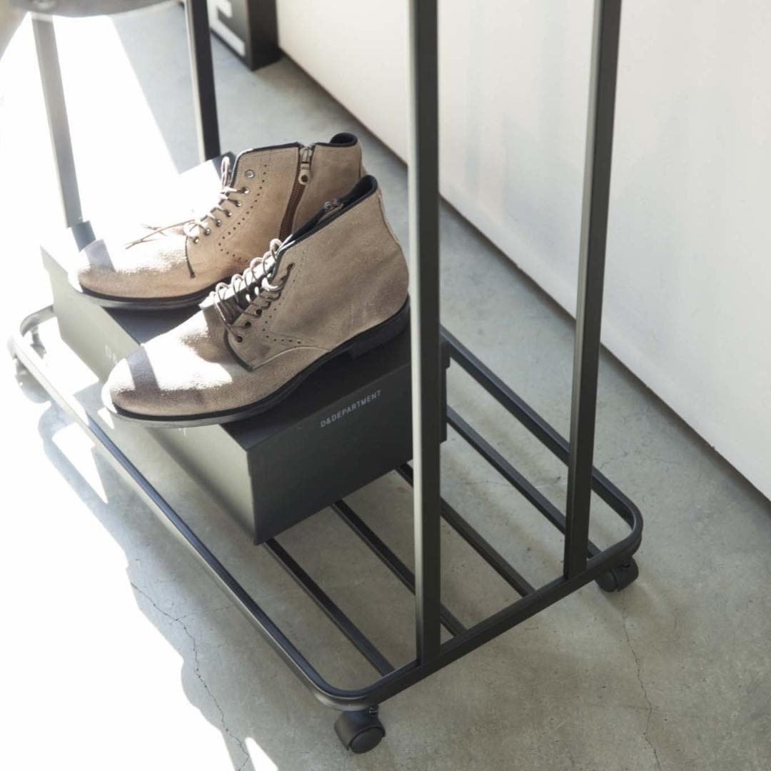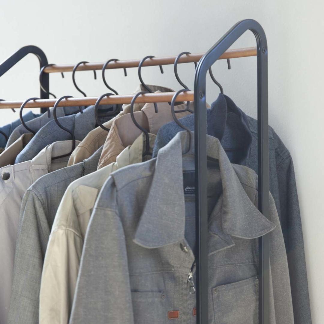 天然木のバーがおしゃれなキャスター付きハンガーラック スチールの本体に天然木のバーがおしゃれなアクセントになった、キャスター付きのハンガーラック。172.5cmと高さのあるデザインで、ロングコートやワンピースも裾を床に付けることなく掛けられます。2段になっているから、お気に入りの洋服をたっぷり収納できるのもポイント。バーはそれぞれ6kgまで耐えられるので、重みのある冬物アウターも安心して掛けられます。台座には、小物類をまとめた収納かごや置き場所に困りがちな通勤バッグなどを収納可能。耐荷重は5kgなので、書類が入った重たいカバンもそのまま置けます。場所を変えたいときもラクラク移動できる便利なキャスター付き。シンプルなデザインでどんな空間にも自然になじむのが魅力です。ホワイト・ブラックの2色展開 カラーバリエーションは、ナチュラルで明るい印象のホワイトと、スタイリッシュでメンズライクな空間にも合わせやすいブラックの2種類です。お部屋の雰囲気や好みに合わせて選んでみてください。