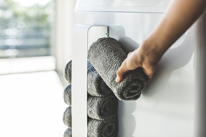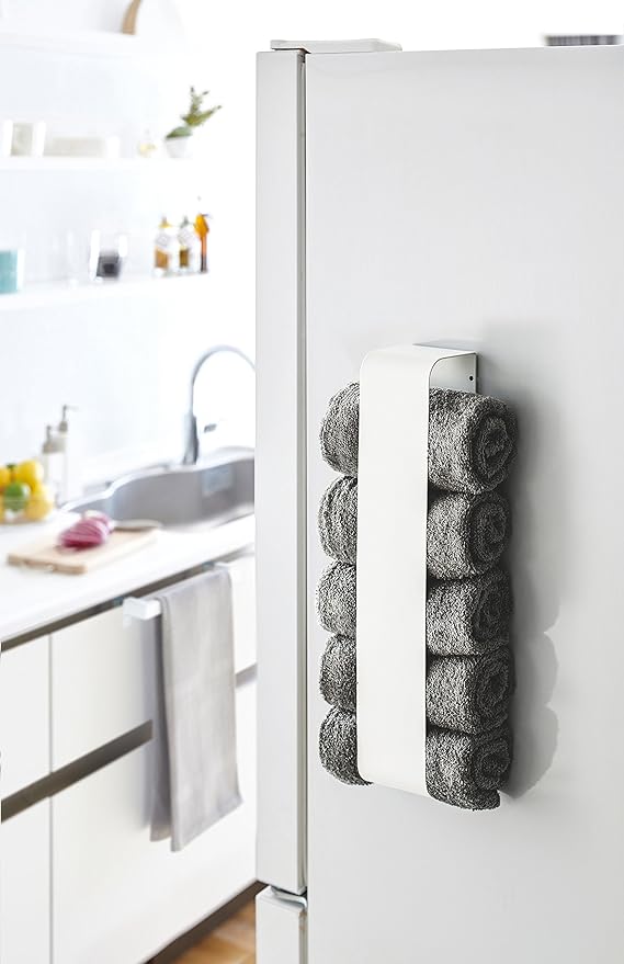 磁石で簡単取り付け。タオルを丸めて洗濯機や冷蔵庫側面などに収納。冷蔵庫側面に取り付ければ替えのキッチンタオルがすぐ取ることができます。洗濯機に取り付ければ洗面所のタオルがすぐ取れて便利。付属の木ネジで簡単取り付け。洗面所やトイレのハンドタオルストッカーとして。