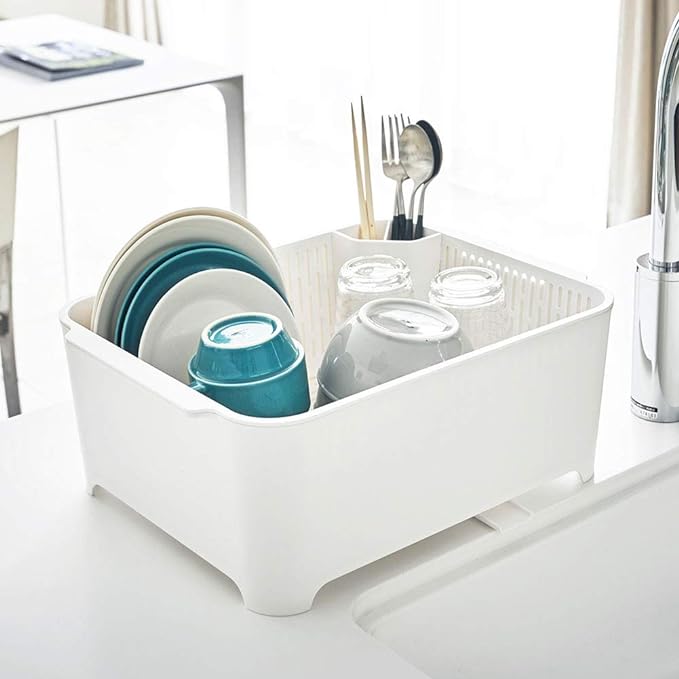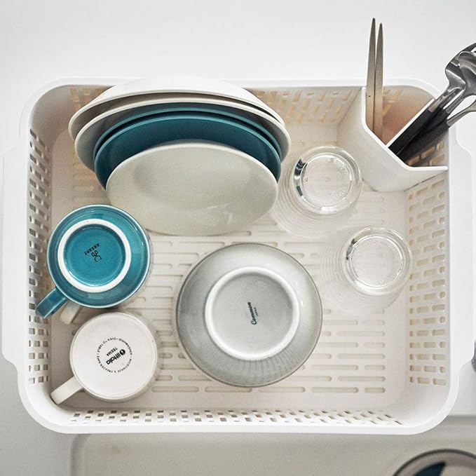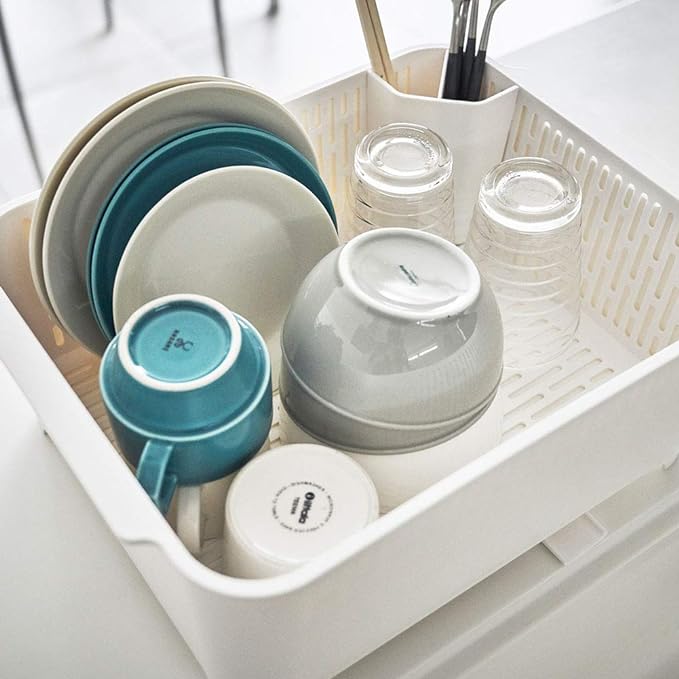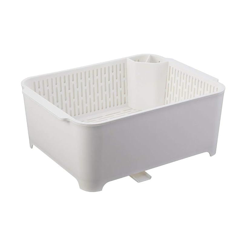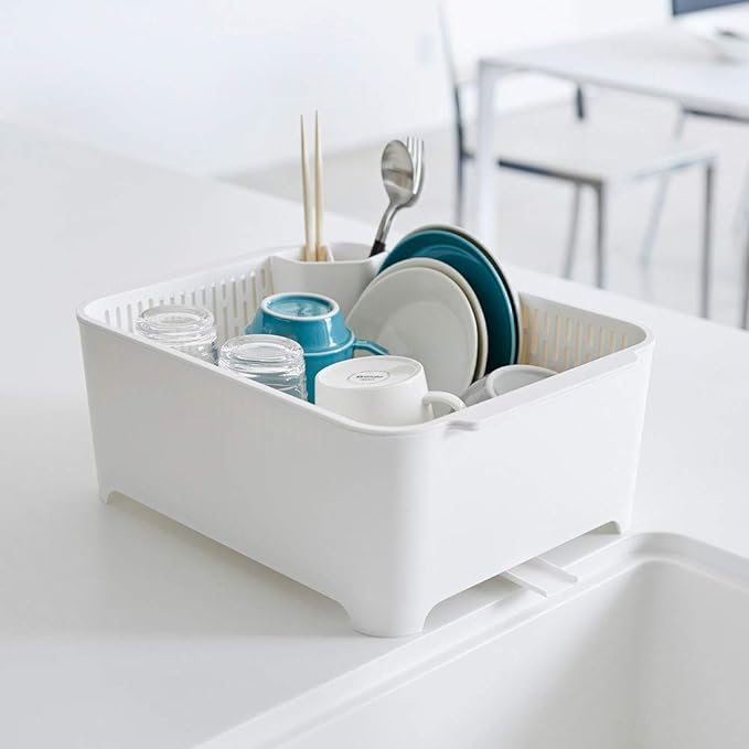 大容量の洗い桶とバスケットの水切りセット。食器の水が直接シンクへ。漬け置きも可能。本体にたまった水を直接シンクに流せる水はけ付き。よく使うグラス・カップ・茶碗・カトラリー・調理道具などをたっぷり収納。食器のつけおき洗いが出来るので節水にもなります。野菜の水洗い桶としても使えます。排水できない場所でも使用可能。好きな方向で排水が出来るので、縦横自由にレイアウトが可能。バスケットの角に脱着式。菜箸・カトラリー・調理道具などを分別できる仕切り付き。ハンドル下に穴が開いており水を流しながら洗い物ができます。移動もラクラク。内側の縁を利用してお皿が立てられます。コップなどの器は浮かせながら干せるので水切れもばっちり。