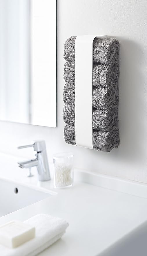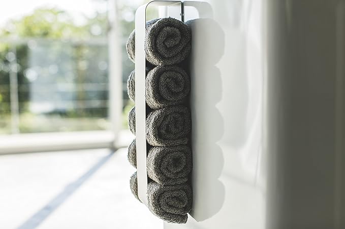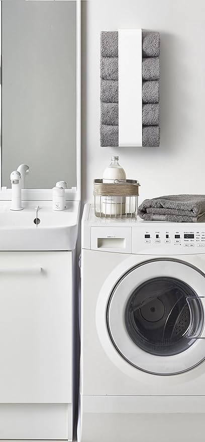 磁石で簡単取り付け。タオルを丸めて洗濯機や冷蔵庫側面などに収納。冷蔵庫側面に取り付ければ替えのキッチンタオルがすぐ取ることができます。洗濯機に取り付ければ洗面所のタオルがすぐ取れて便利。付属の木ネジで簡単取り付け。洗面所やトイレのハンドタオルストッカーとして。