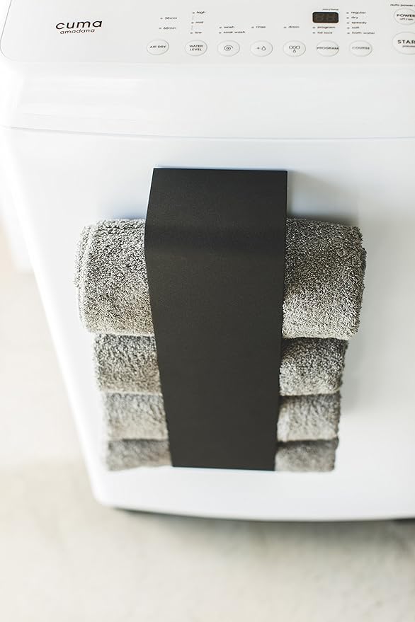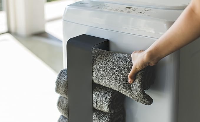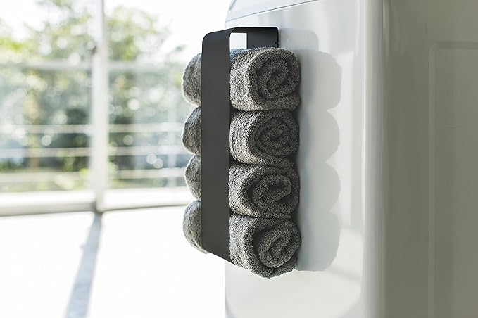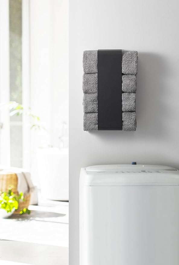 磁石で簡単取り付け。バスタオルを丸めて洗濯機や壁面にすっきり収納。使ったバスタオルはそのまま洗濯機へ。洗濯機に取り付ければ洗面所のタオルがすぐ取れて便利。付属の木ネジで簡単取り付け。