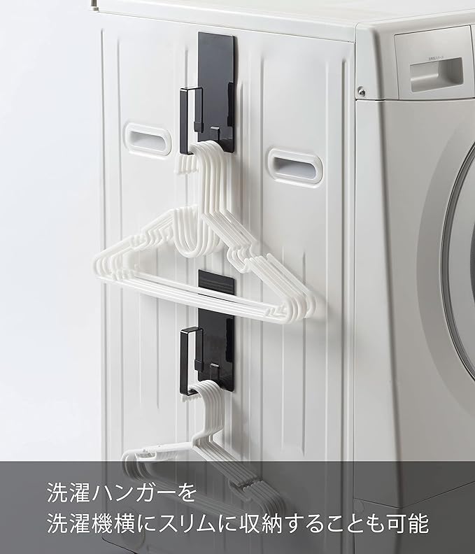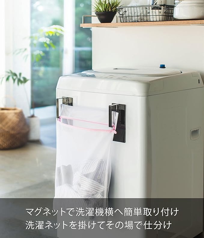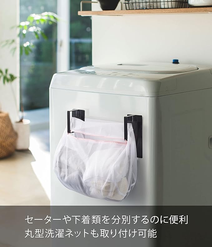 磁石で洗濯機に簡単取り付け。洗濯ネットを引っ掛けて洗濯物をその場で仕分け。セーターや下着類の分別に。レジ袋を掛ければ簡易ゴミ箱としても使えます。洗濯ハンガーを洗濯機横にスリムに収納可能。セーターや下着類を分別するのに便利。丸型洗濯ネットも取り付け可能。