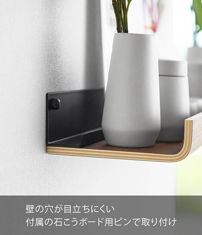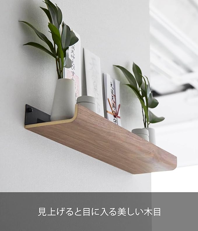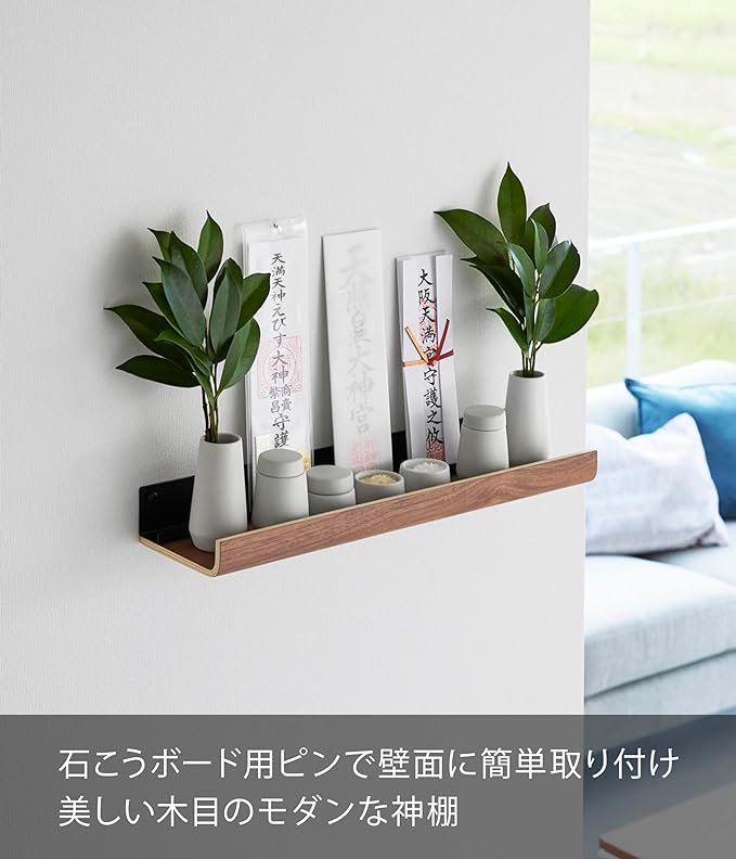手軽に神棚をお家に。 石こうボードピンで簡単 神棚としての神聖さはそのままに、現代のお家にも似合う洗練されたデザインです。美しい木目がお部屋の雰囲気によく似合っていて、洋風のお家でも和風のお家でも違和感なくなじみます。お正月や祈祷でいただいてきた神札をお供えするのにぴったり。温かみのある2色のカラーバリエーション カラーは、重厚感のあるブラウンと、柔らかな色合いのナチュラルをご用意しました。木のぬくもりが感じられ、木目によって一つ一つに個性があります。扉や巾木の色などに合わせてお好きなカラーをお選びください。仕切り効果で神札が倒れない。 神棚の後方には神札がきちんと立つように仕切りが付いています。そのおかげで時間経過とともに神札が段々と倒れていく、なんてことが起こりにくいのが◎。正面から見ると仕切りが見えづらくスタイリッシュなフォルムです。手持ちの神具と一緒に。省スペースでおしゃれ 神札だけでなく、お手持ちの神具と合わせてお使いいただけます。省スペースに設置できるので、「神棚のために広い空間を用意できない……」というお悩みも解決です。スマートな佇まいでインテリアを損なうこともありません。壁の穴が目立ちにくい石こうボードピン取り付け 石こうボードピンで設置するので、取り外したときに壁の穴が目立ちにくいのがうれしいポイント。大きな力は必要なく、コインを使って指でピンをぐっと押し込むだけ。女性でも簡単に取り付けが完了します。付属の木ネジを使えば柱や板壁に取り付けることも可能です。