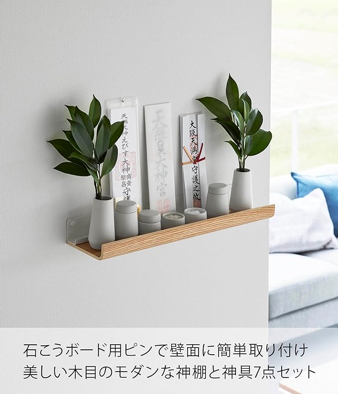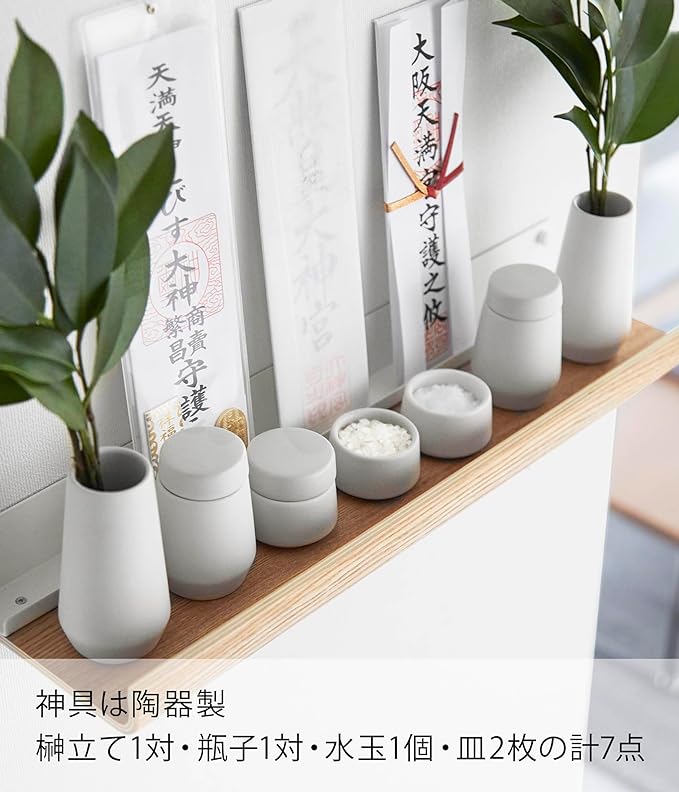 RIN 石こうボード壁対応 神棚 神具セット ナチュラル お札立て 陶器 神棚+神具7点セット